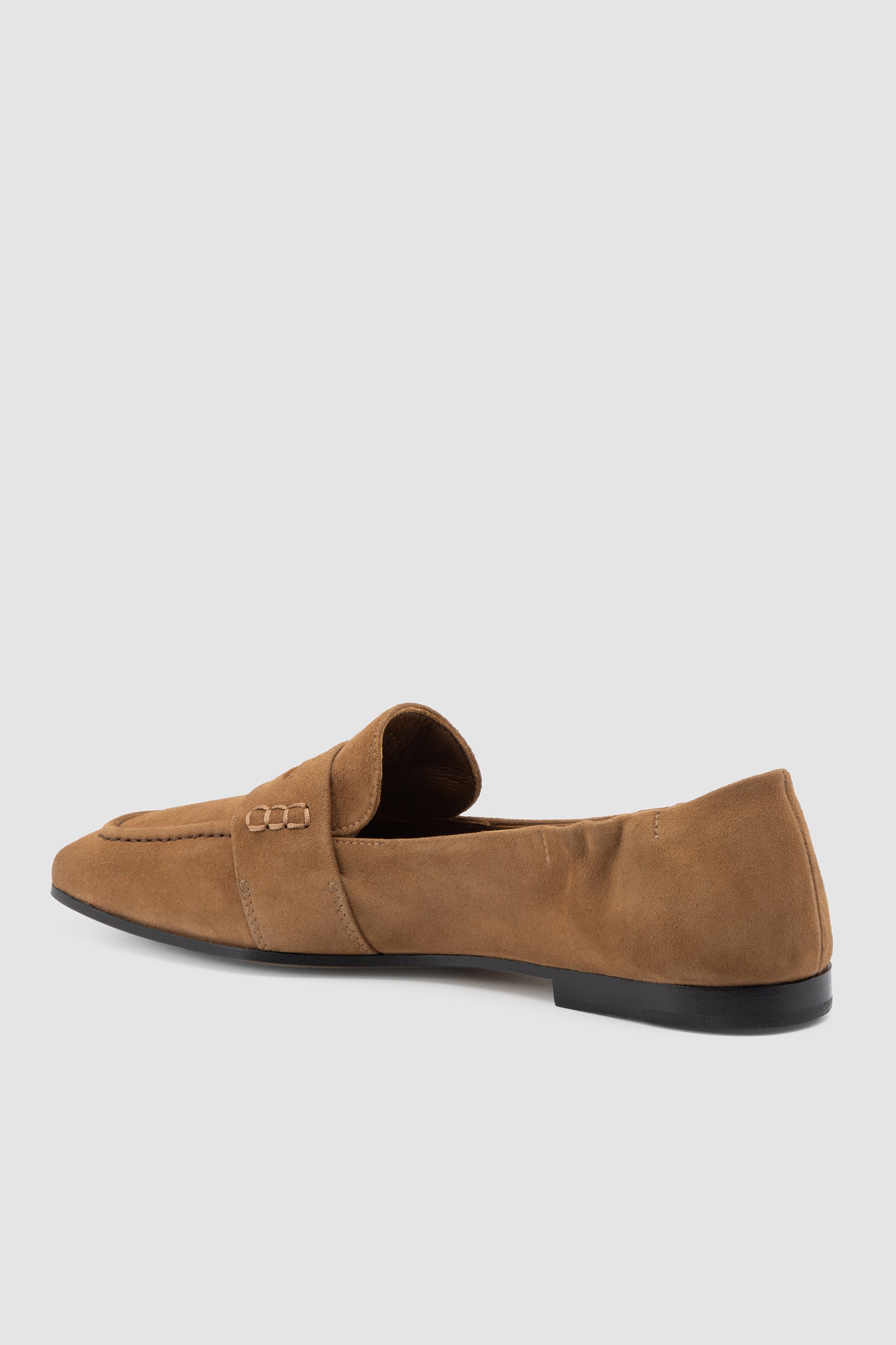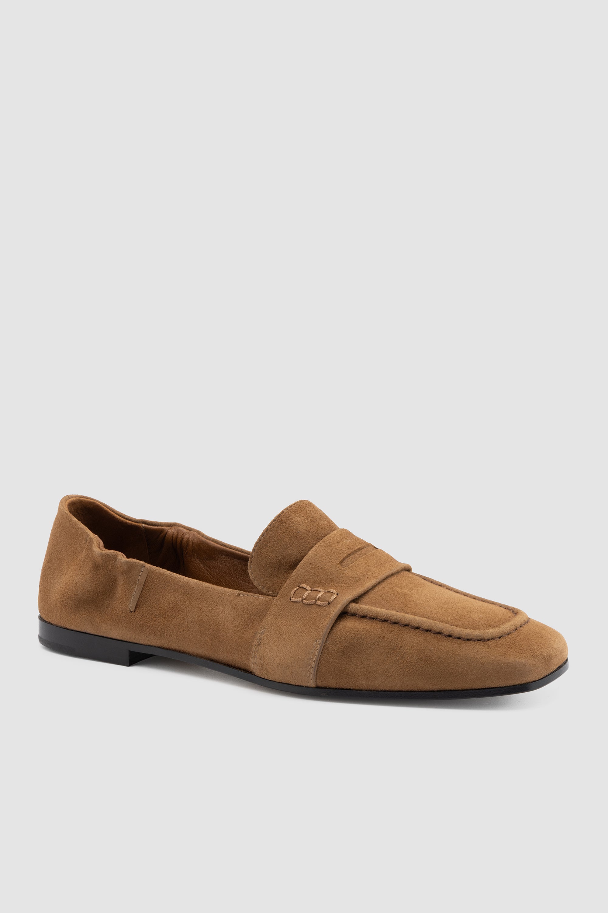 Mocassino in pelle reverse toffee, con punta arrotondata stile moc‑toe e fascetta classica. Fodera in pelle e suola in cuoio con inserto in gomma.