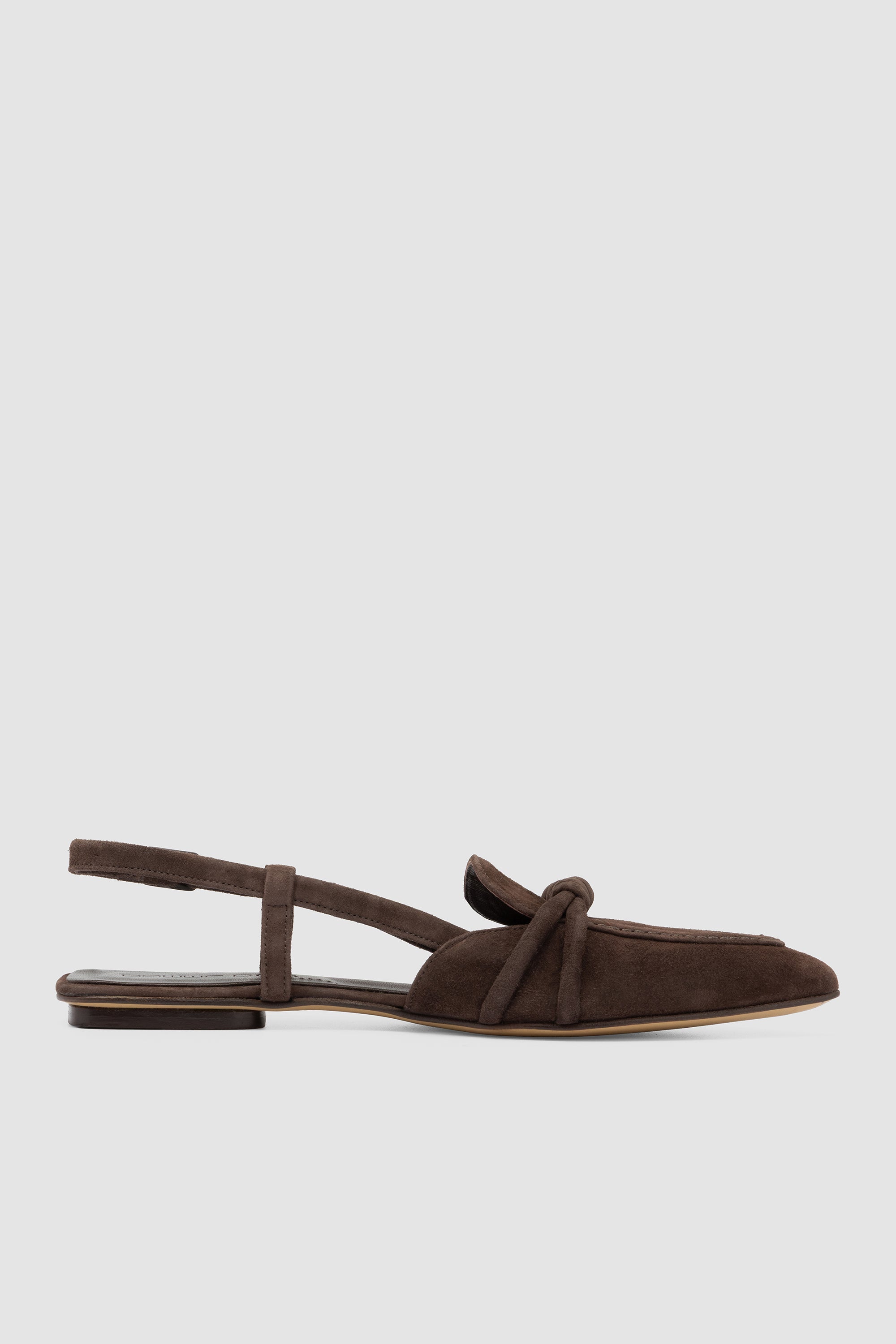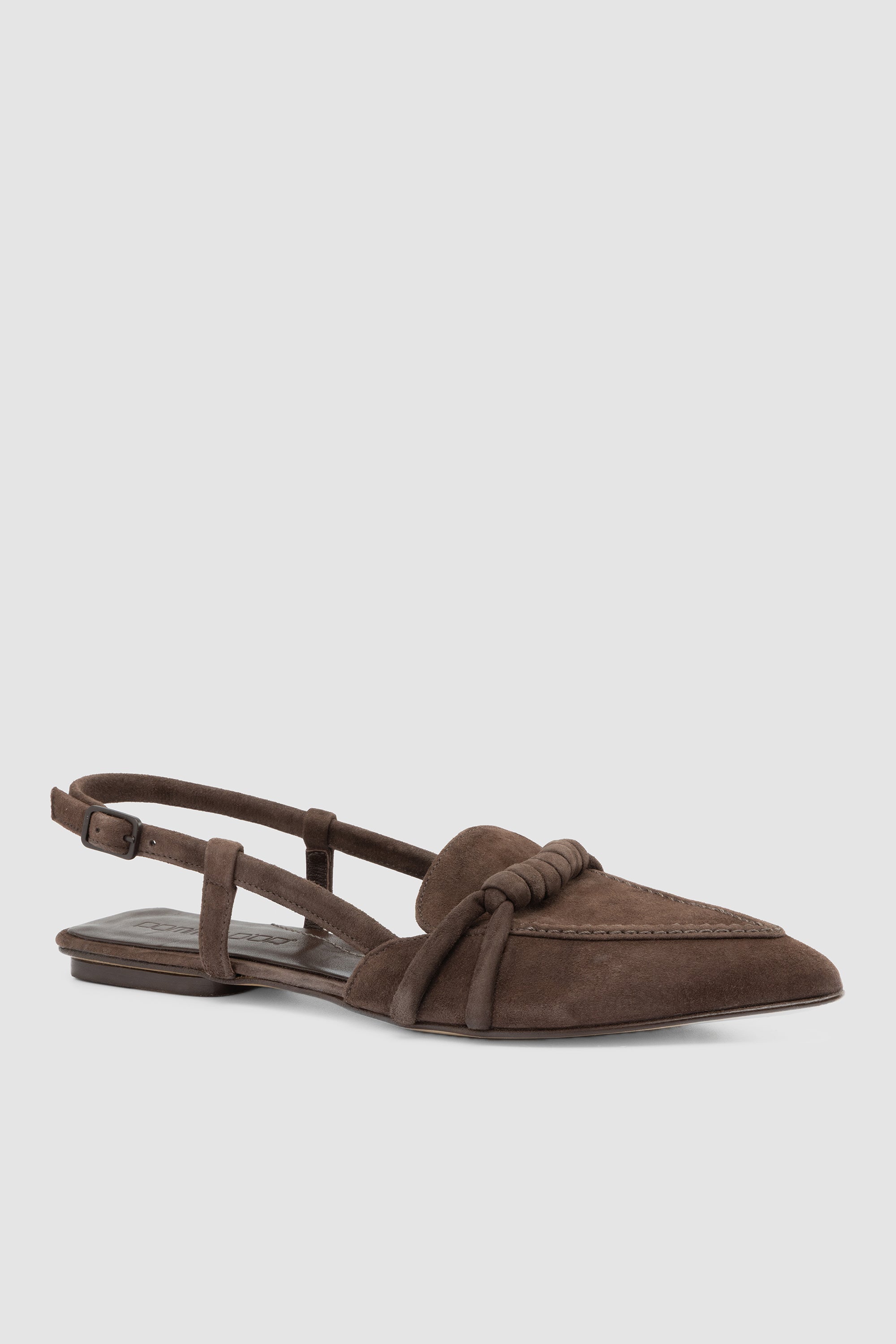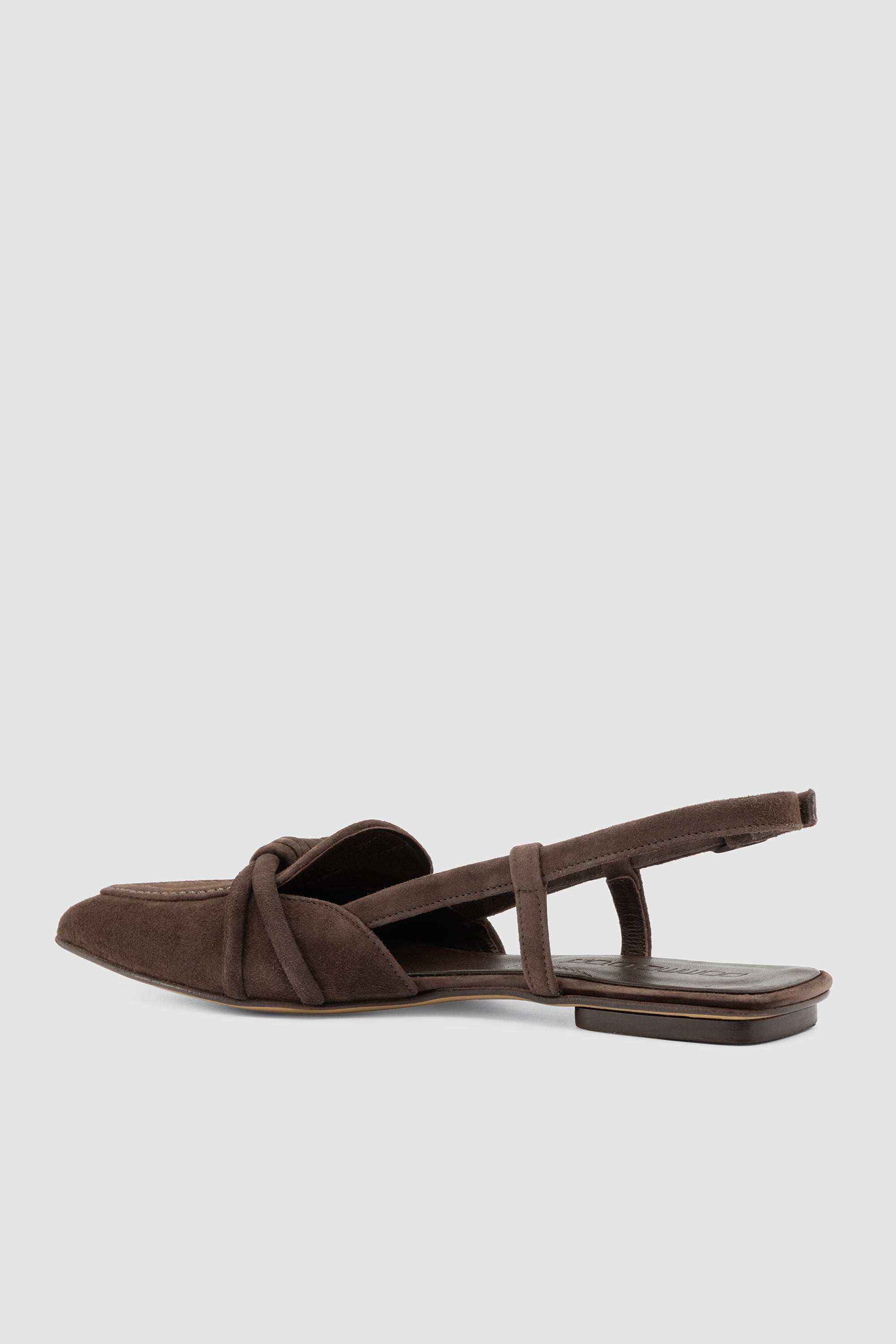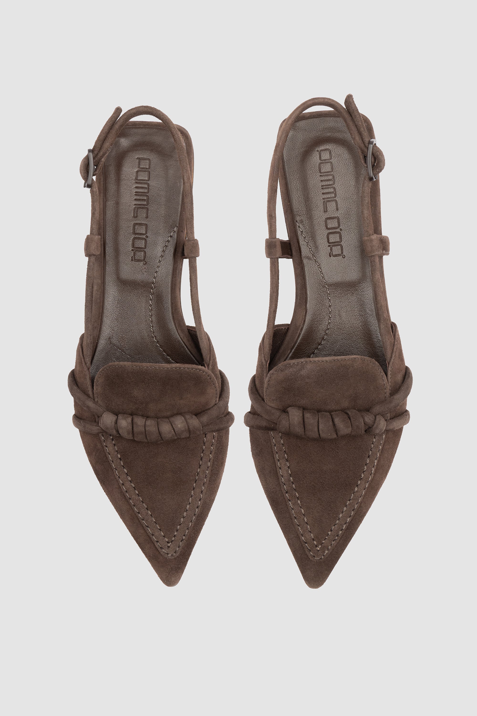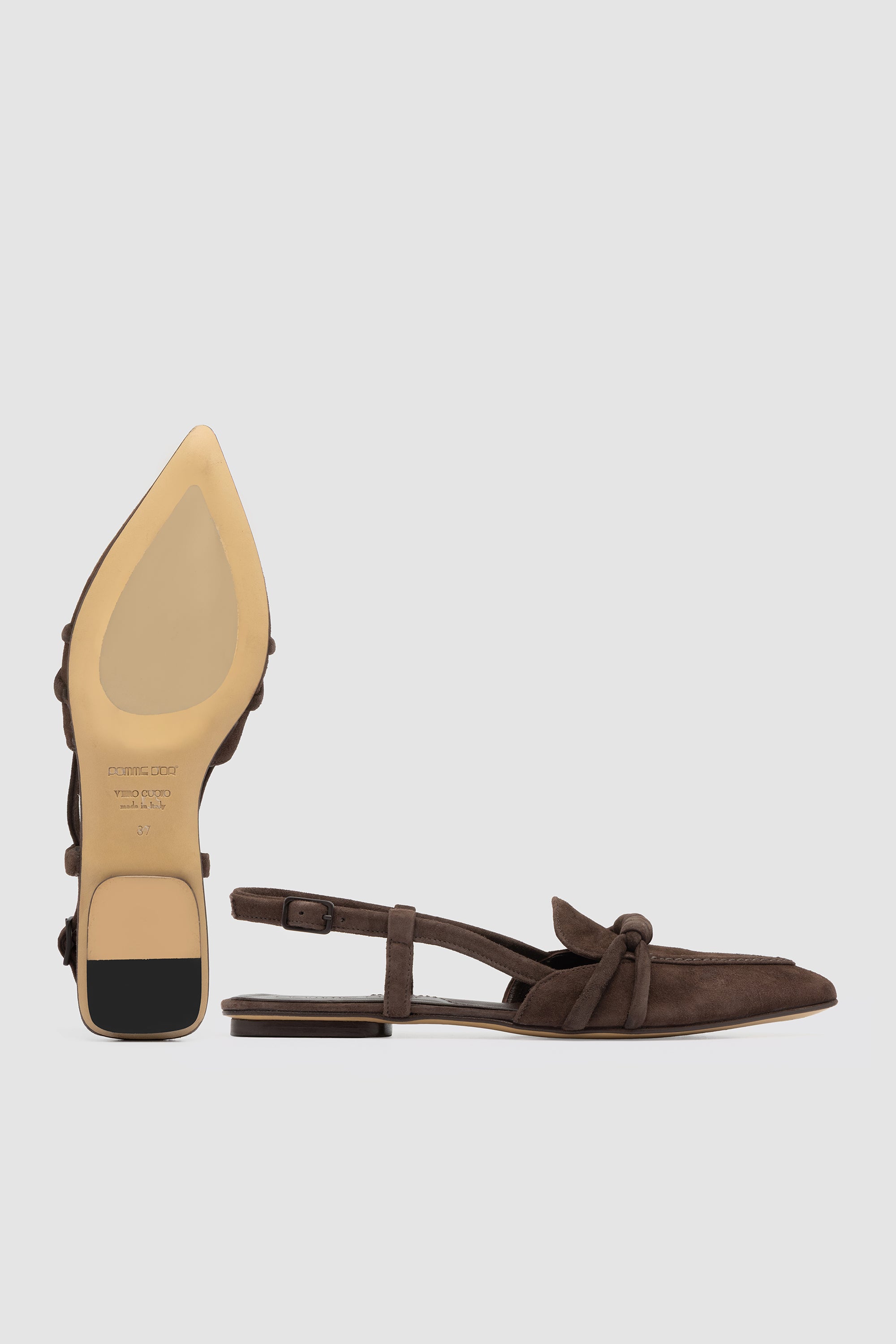 Ballerina in camoscio Espresso con punta affusolata, cinturino posteriore e nodo decorativo. Fodera in pelle e suola in cuoio con inserto in gomma.