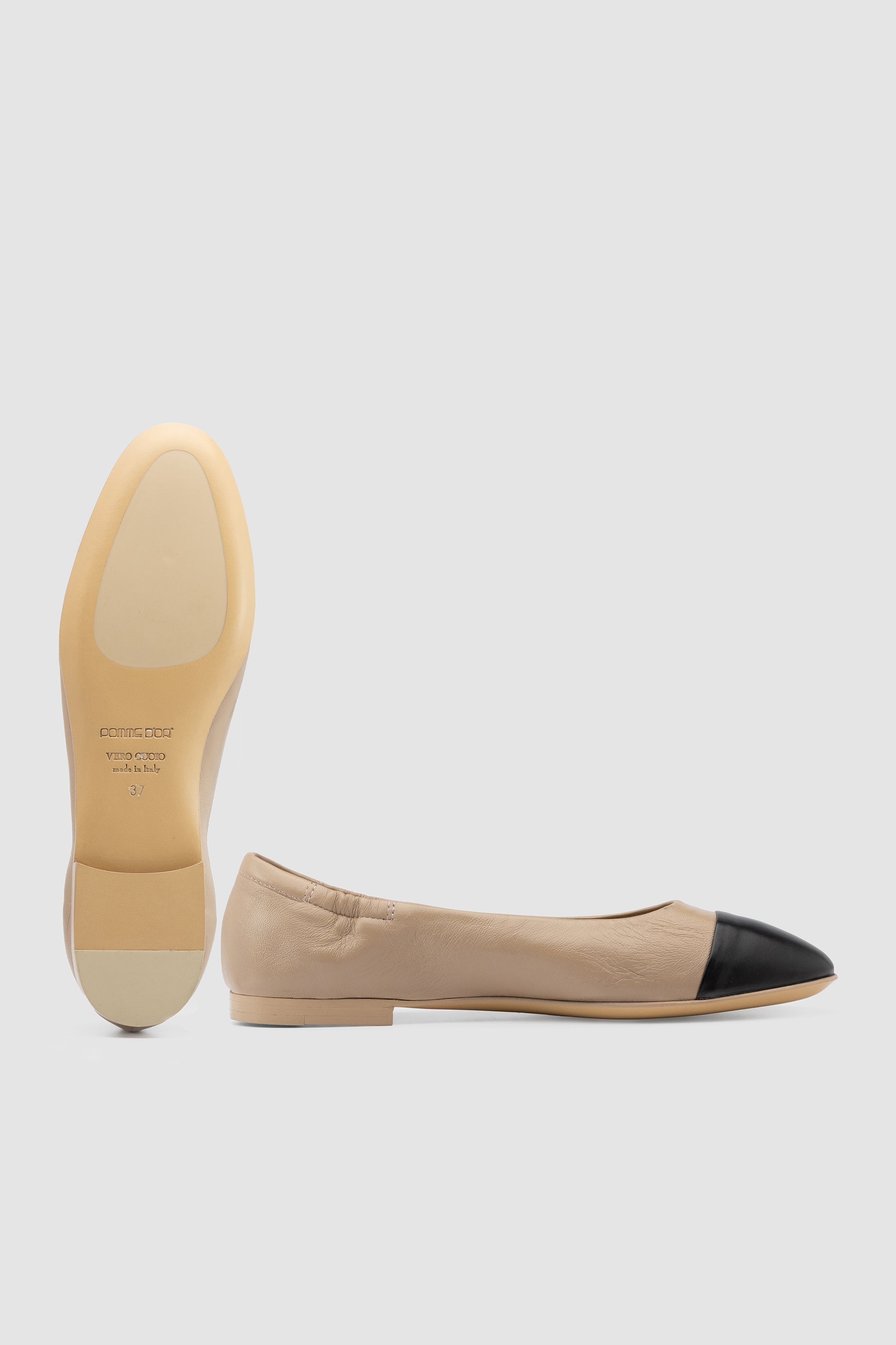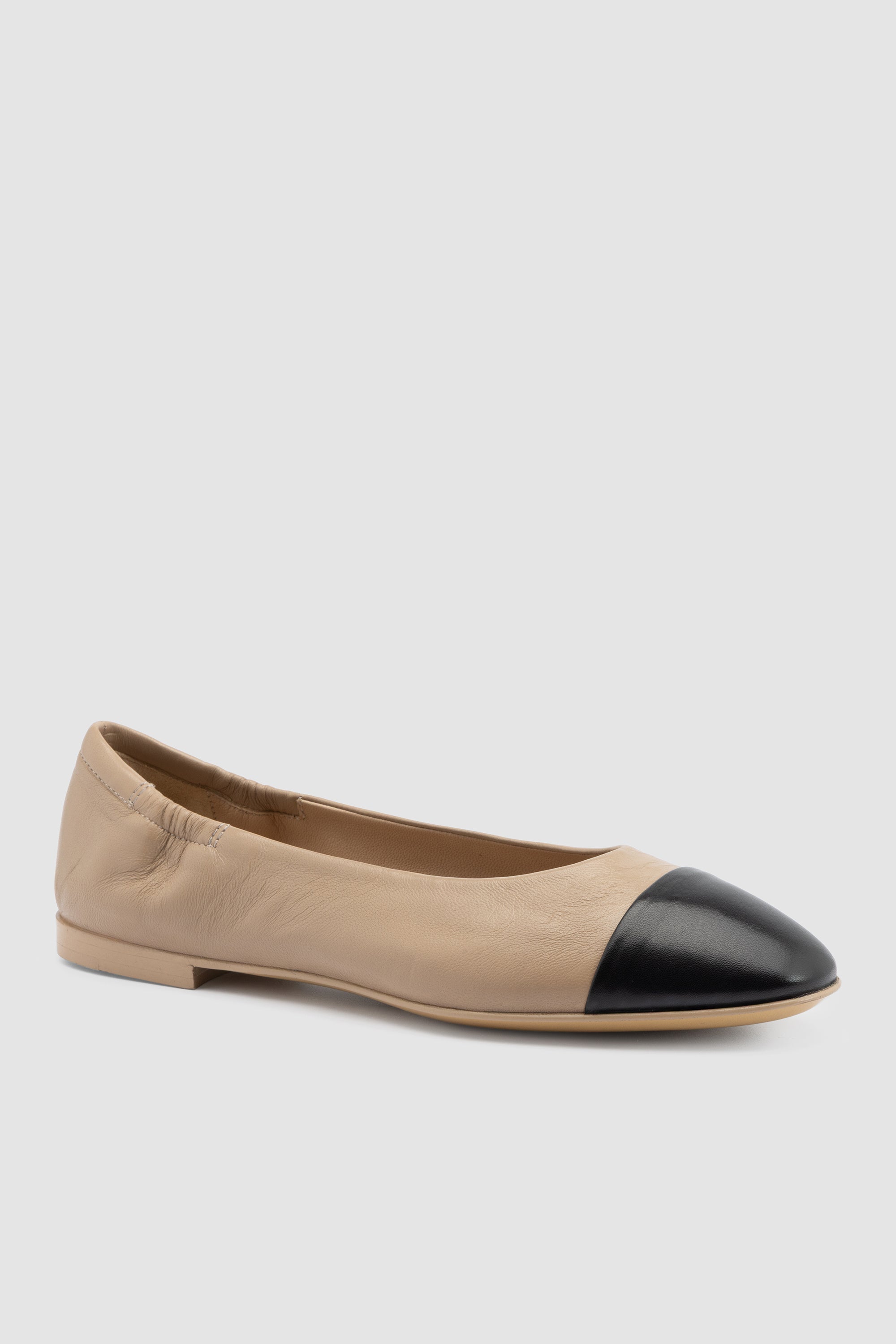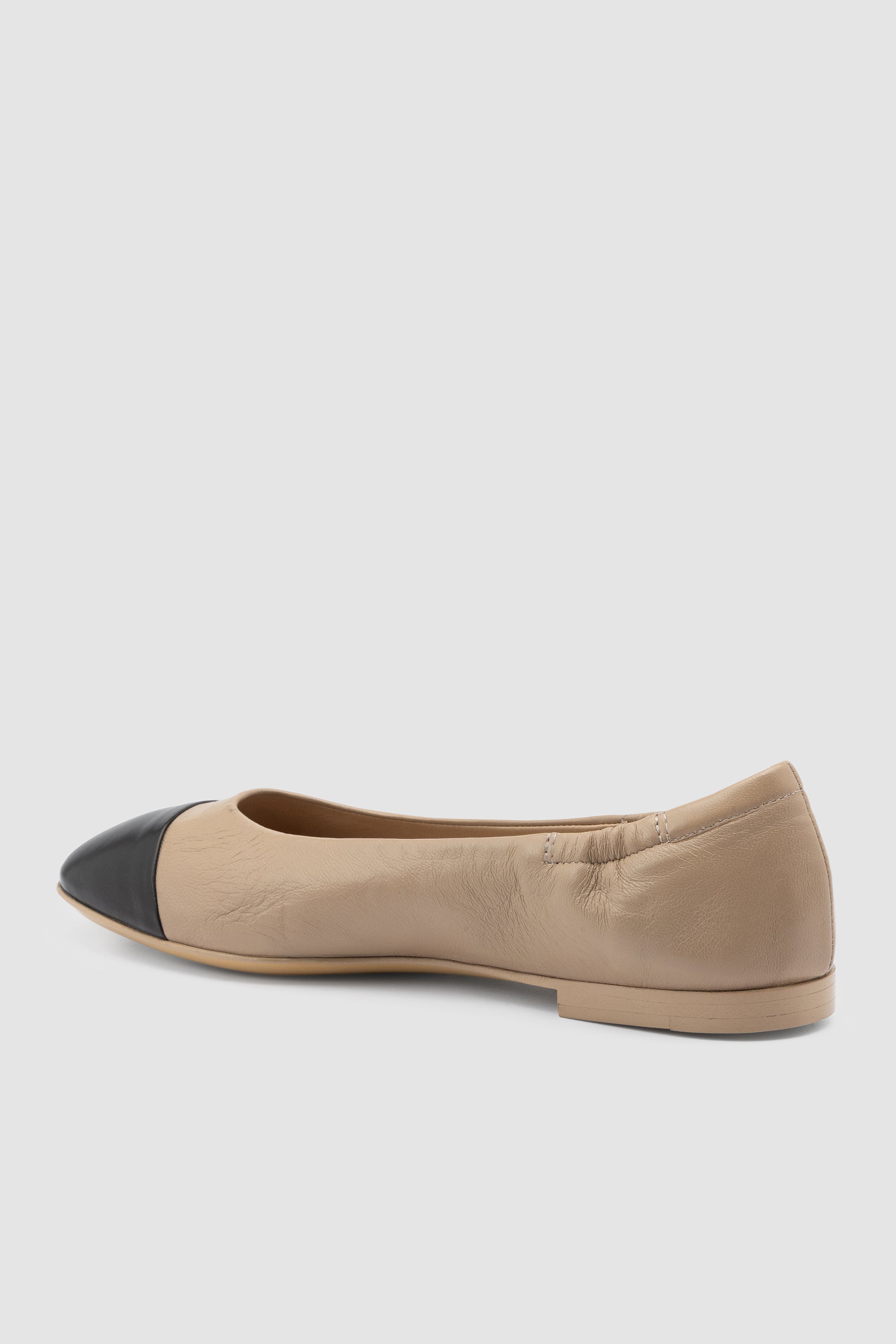 Ballerina in pelle Soft Mocha con punta nera. Fodera in pelle e suola in cuoio con inserto in gomma.