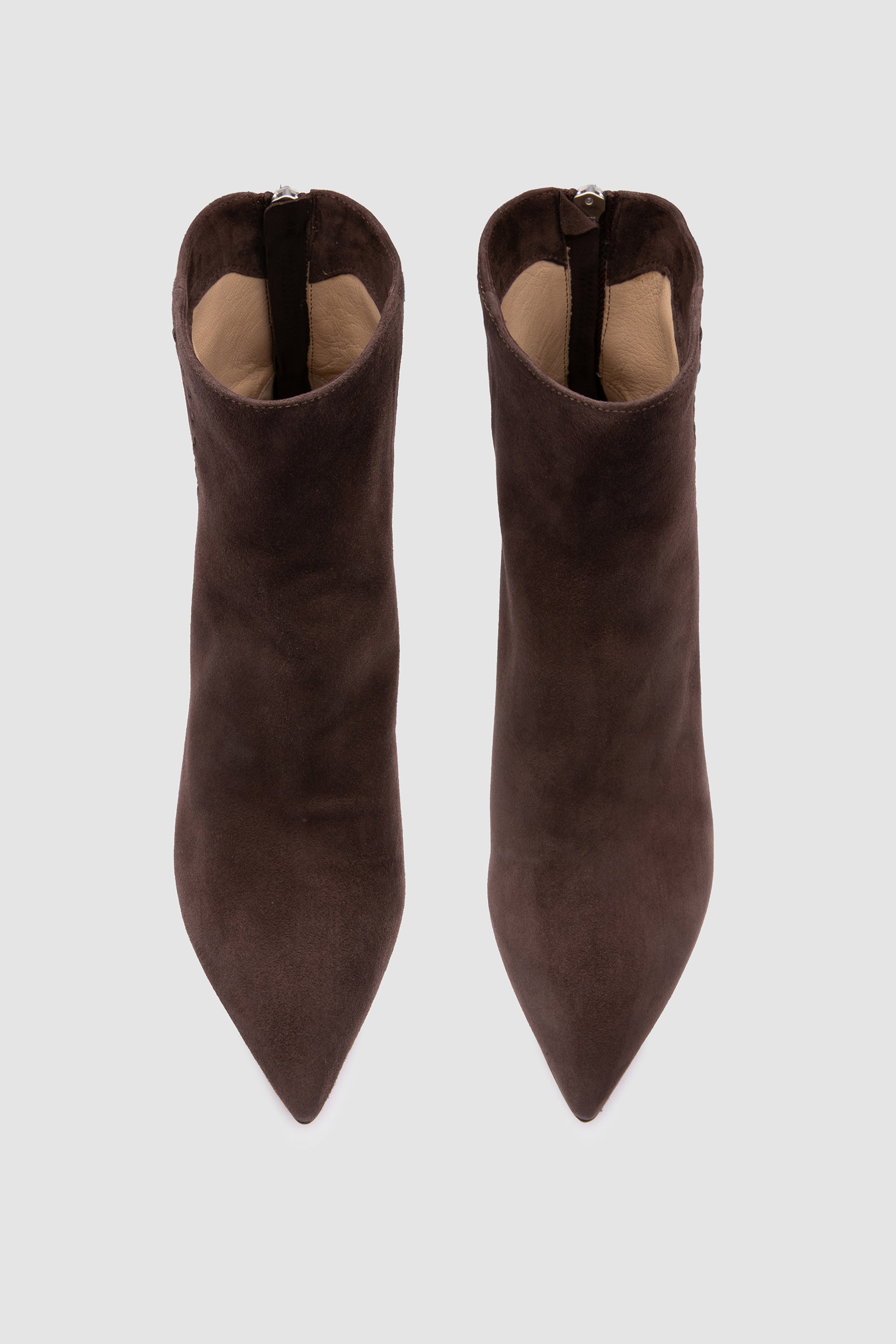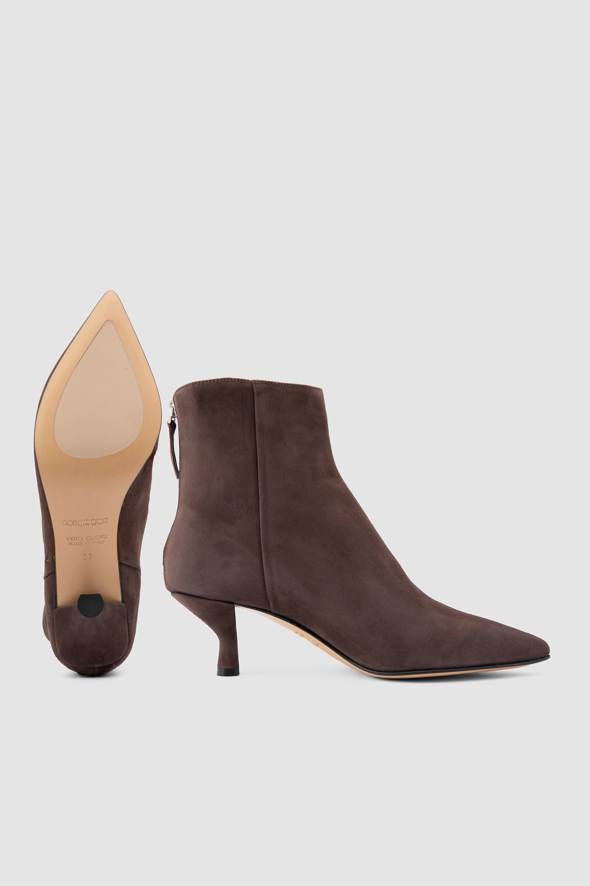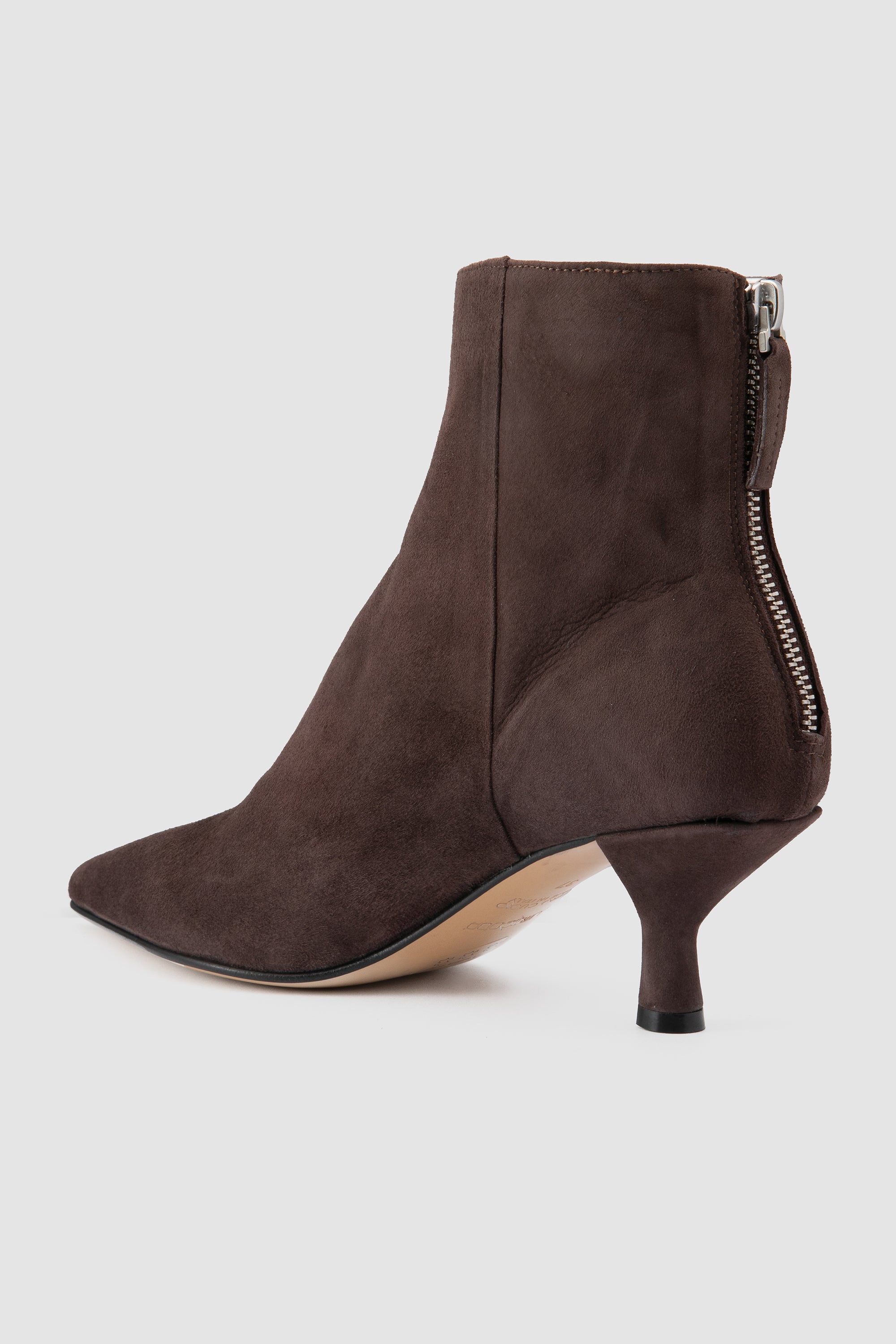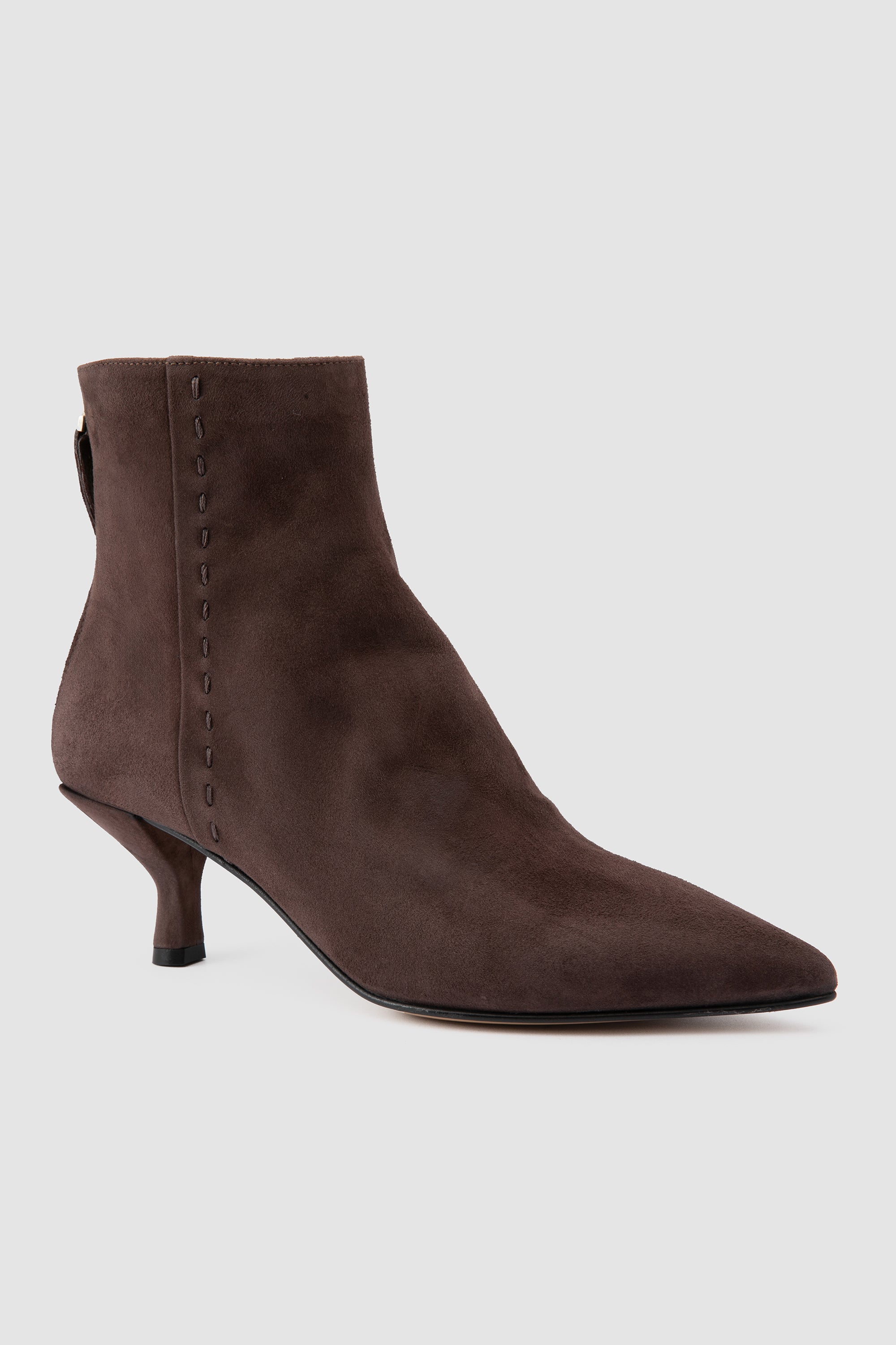 Suede ankle boot, with rear zip closure and tone-on-tone decorative stitching on the side. Soft leather lining and leather sole with rubber insert.