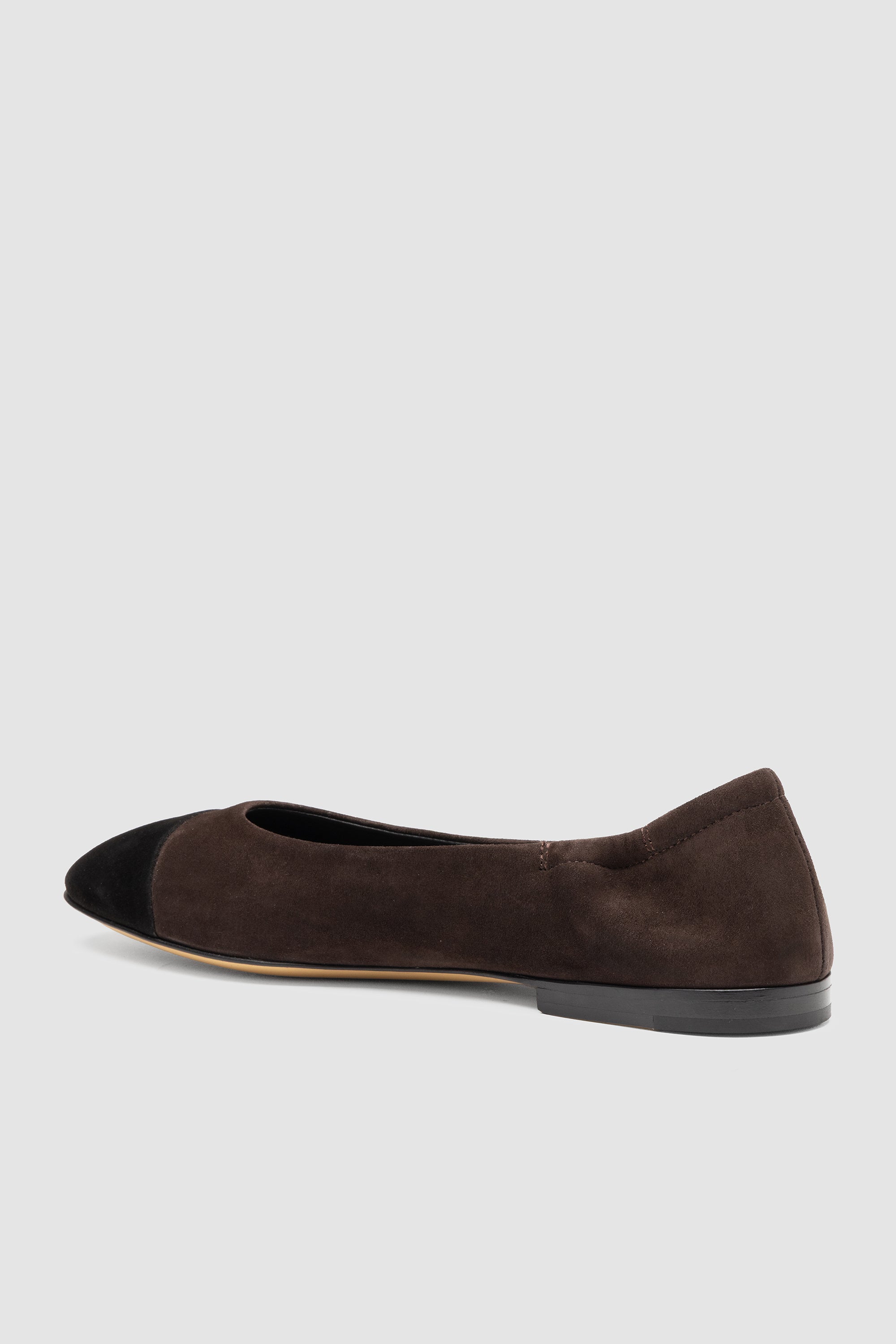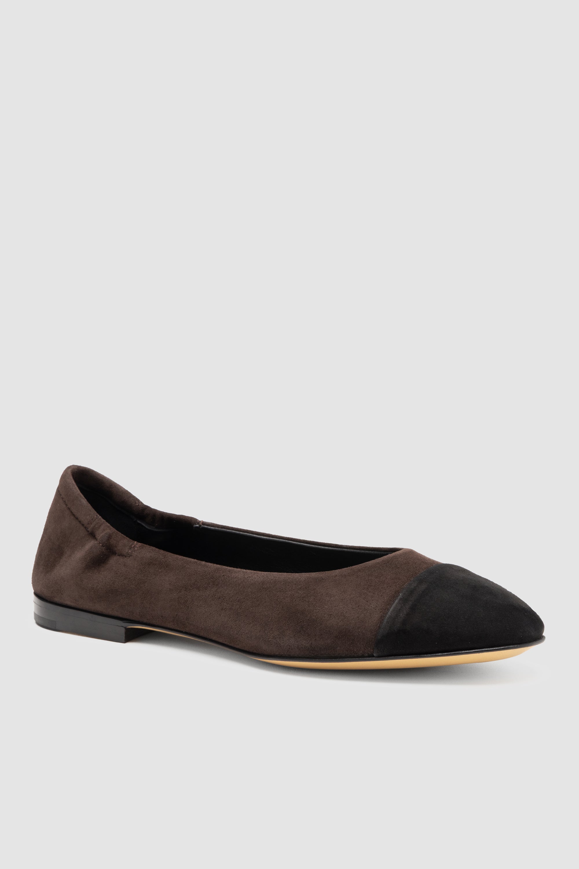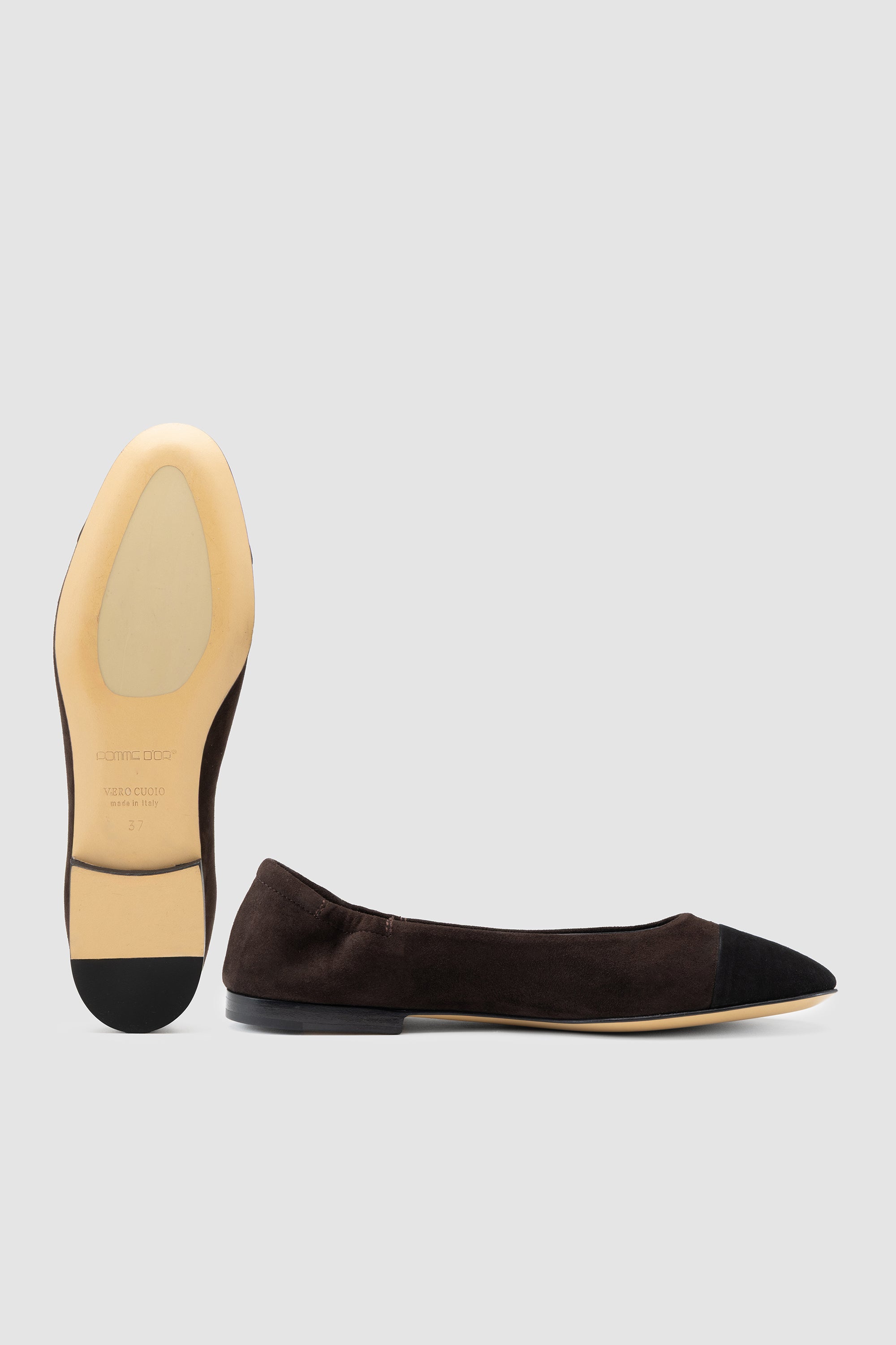 Dark brown suede ballerina flat shoe, featuring a black toe, with soft leather lining and leather sole with rubber inserts.