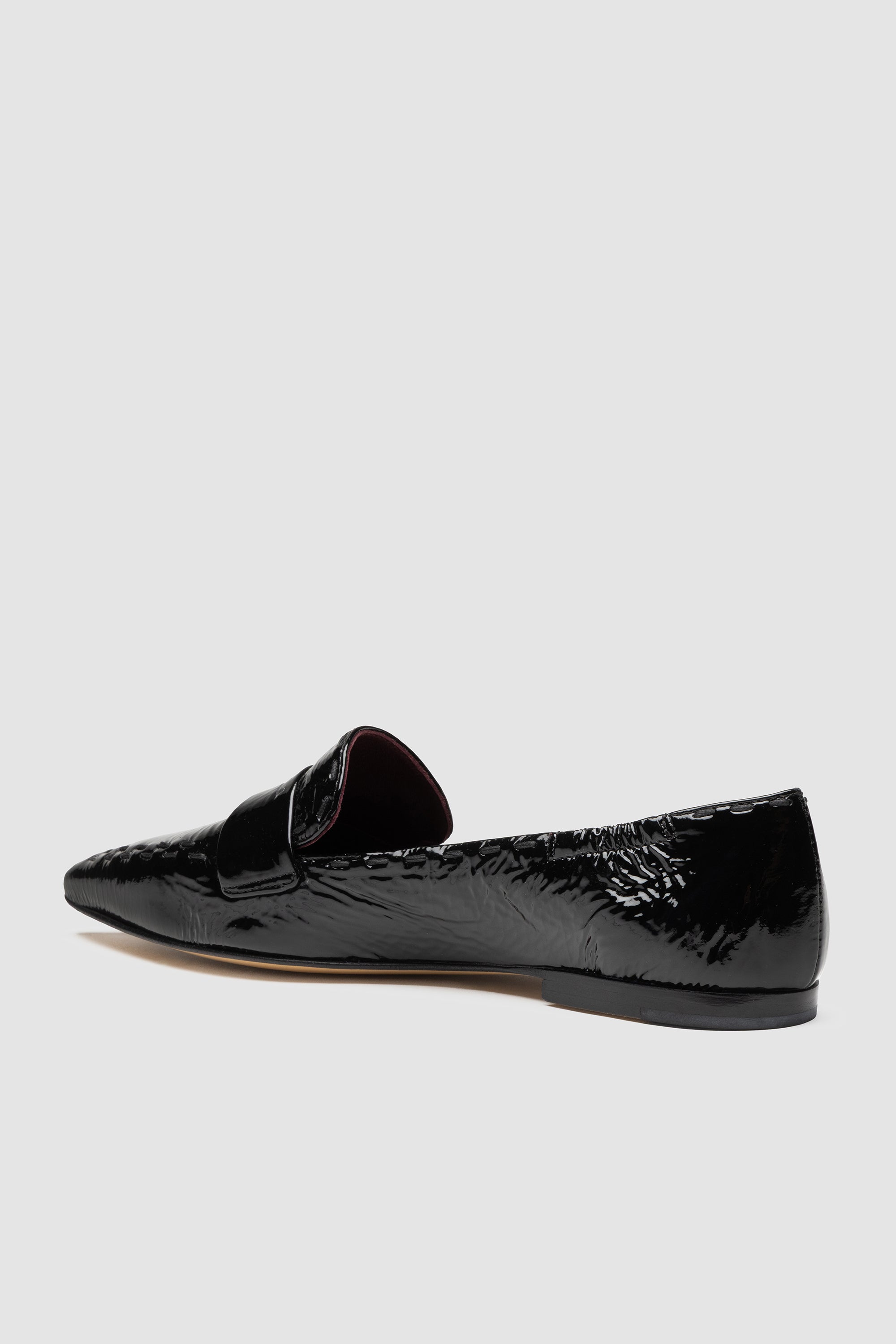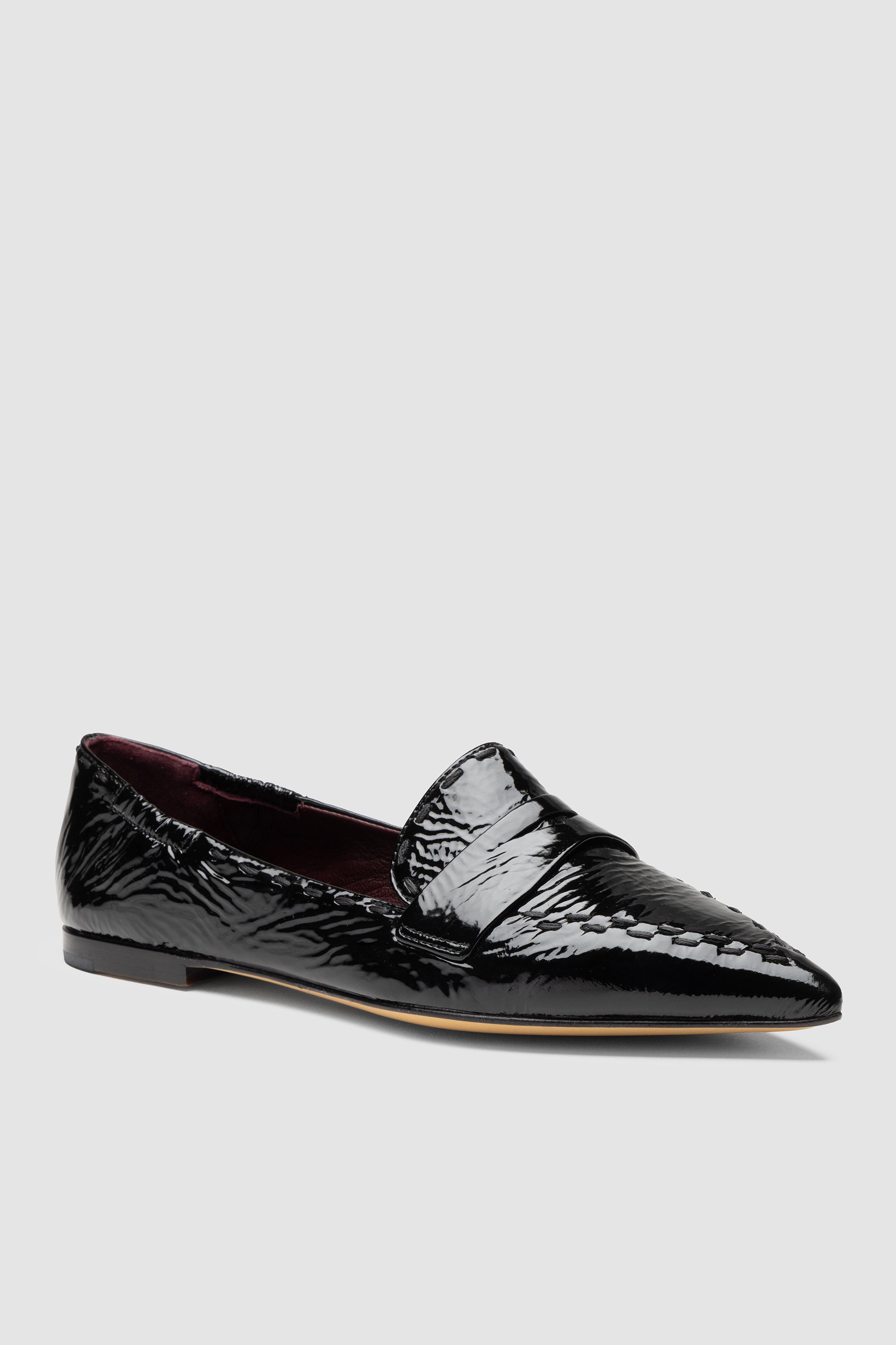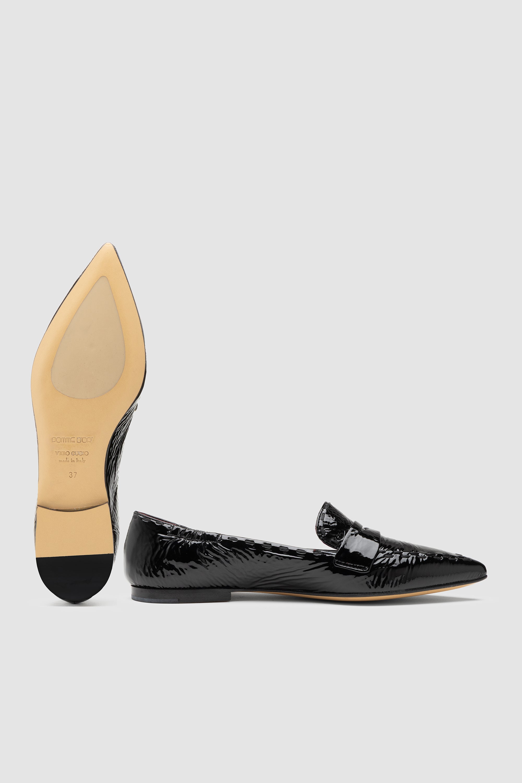 Patent leather flat shoe, with soft leather lining and leather sole with rubber inserts.