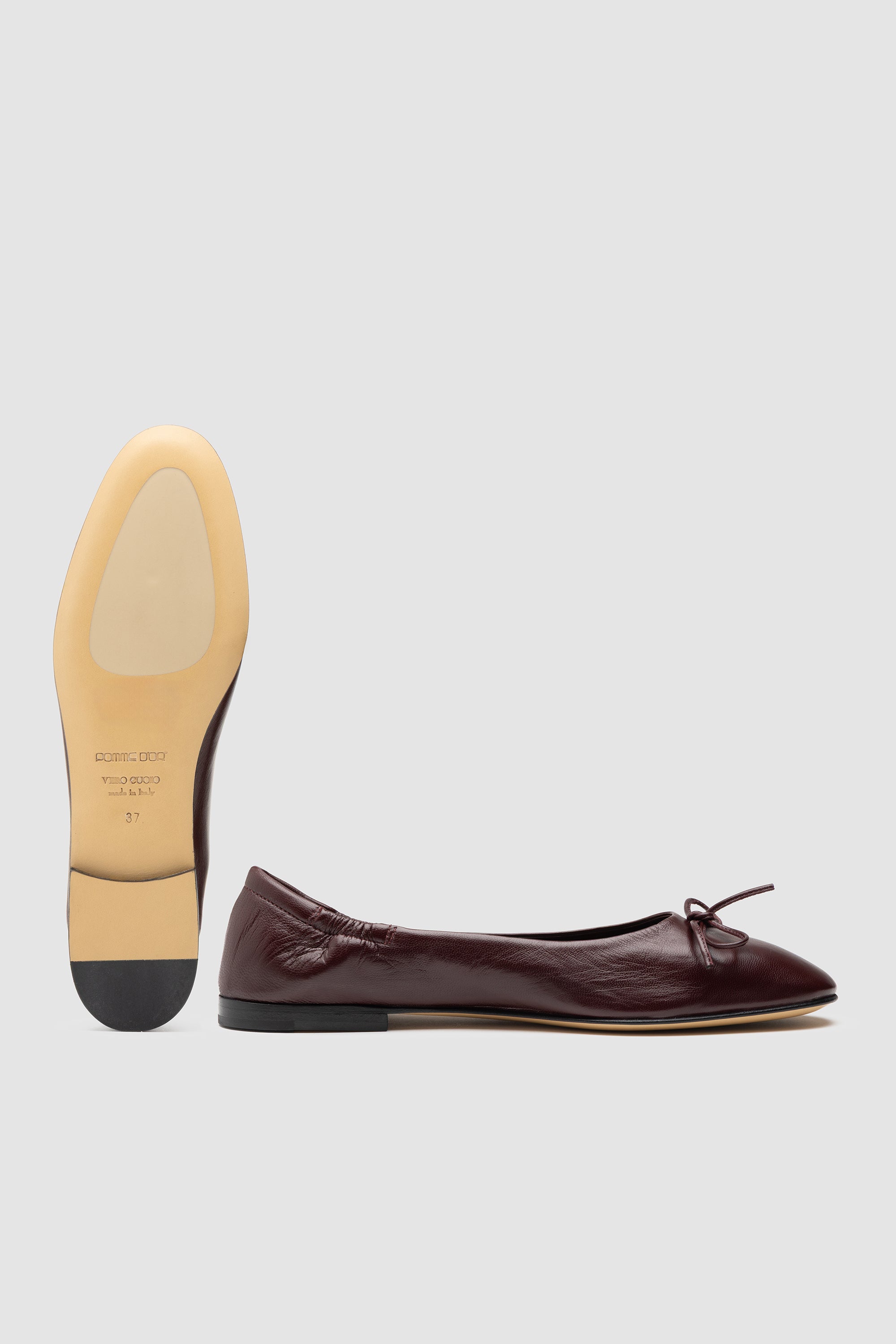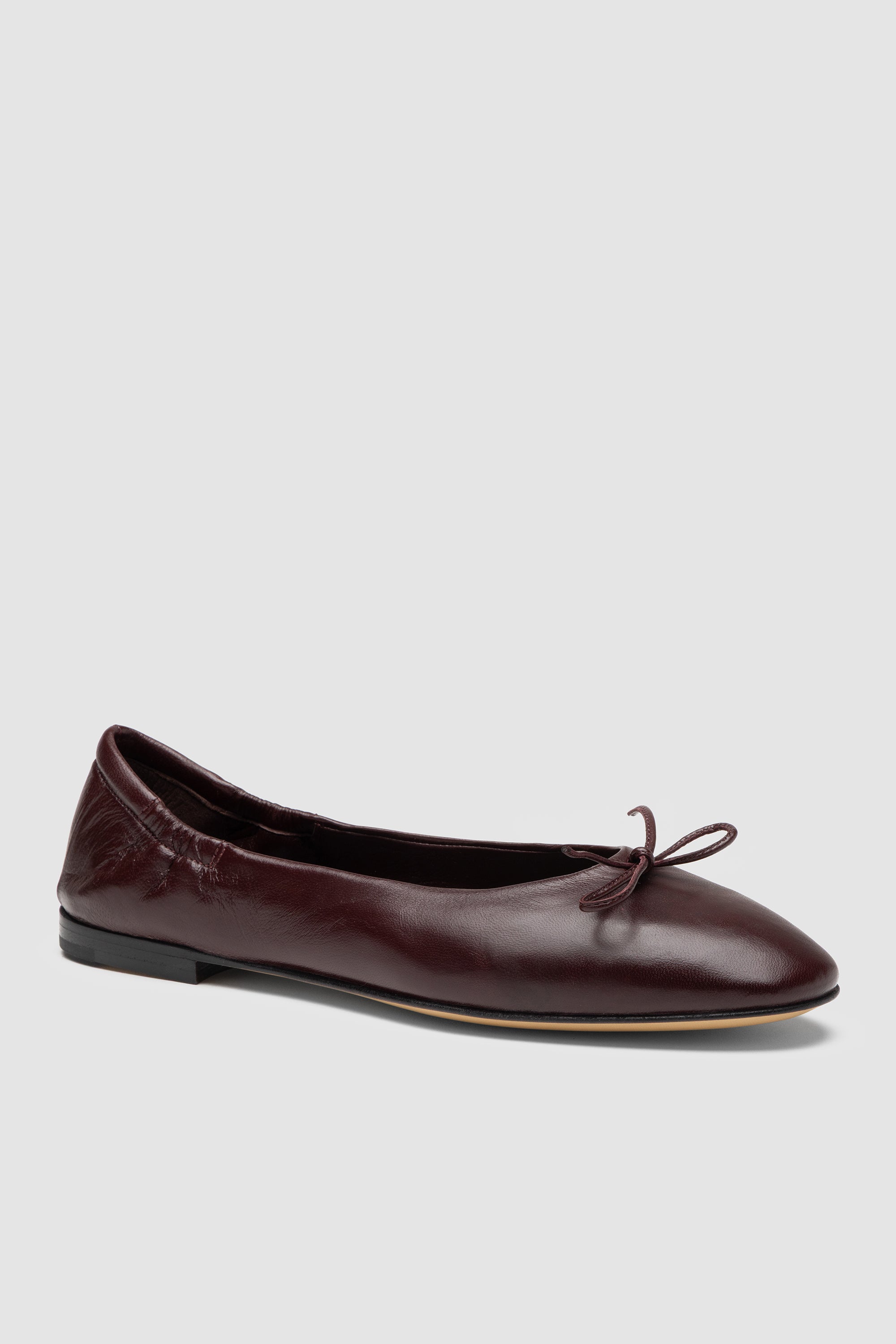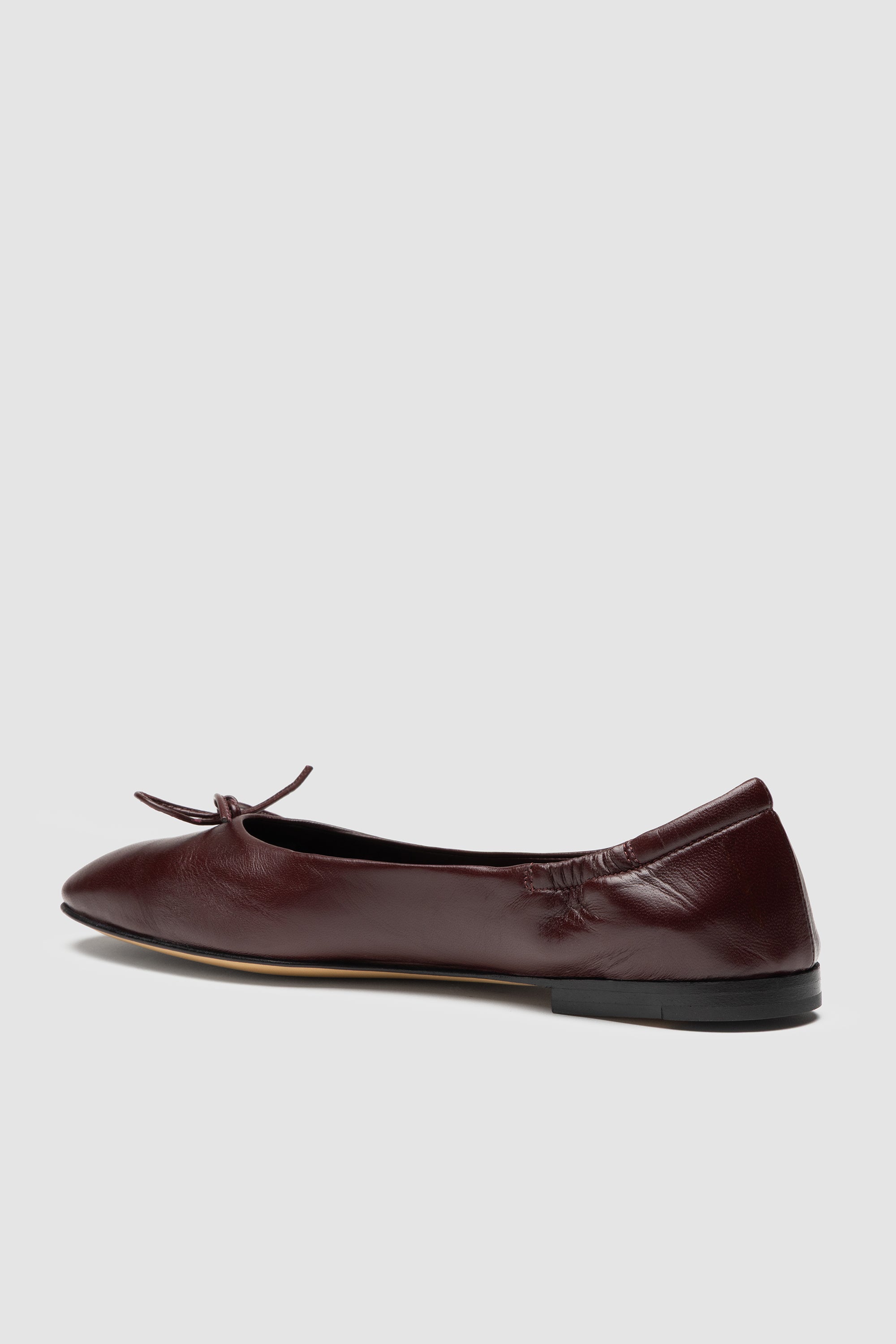 Burgundy ballerina flat shoe, featuring a tied bow, with soft leather lining and leather sole with rubber inserts.