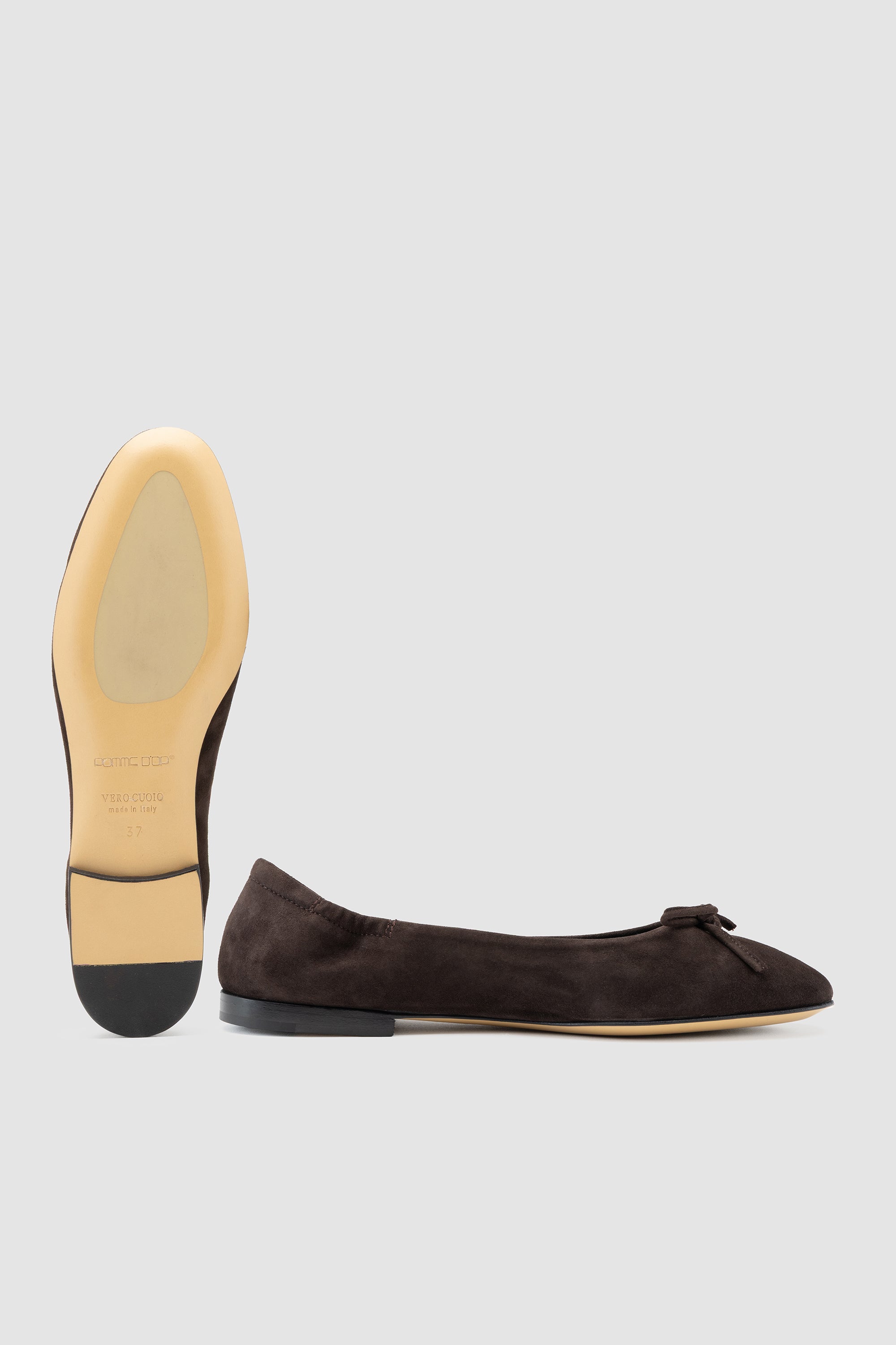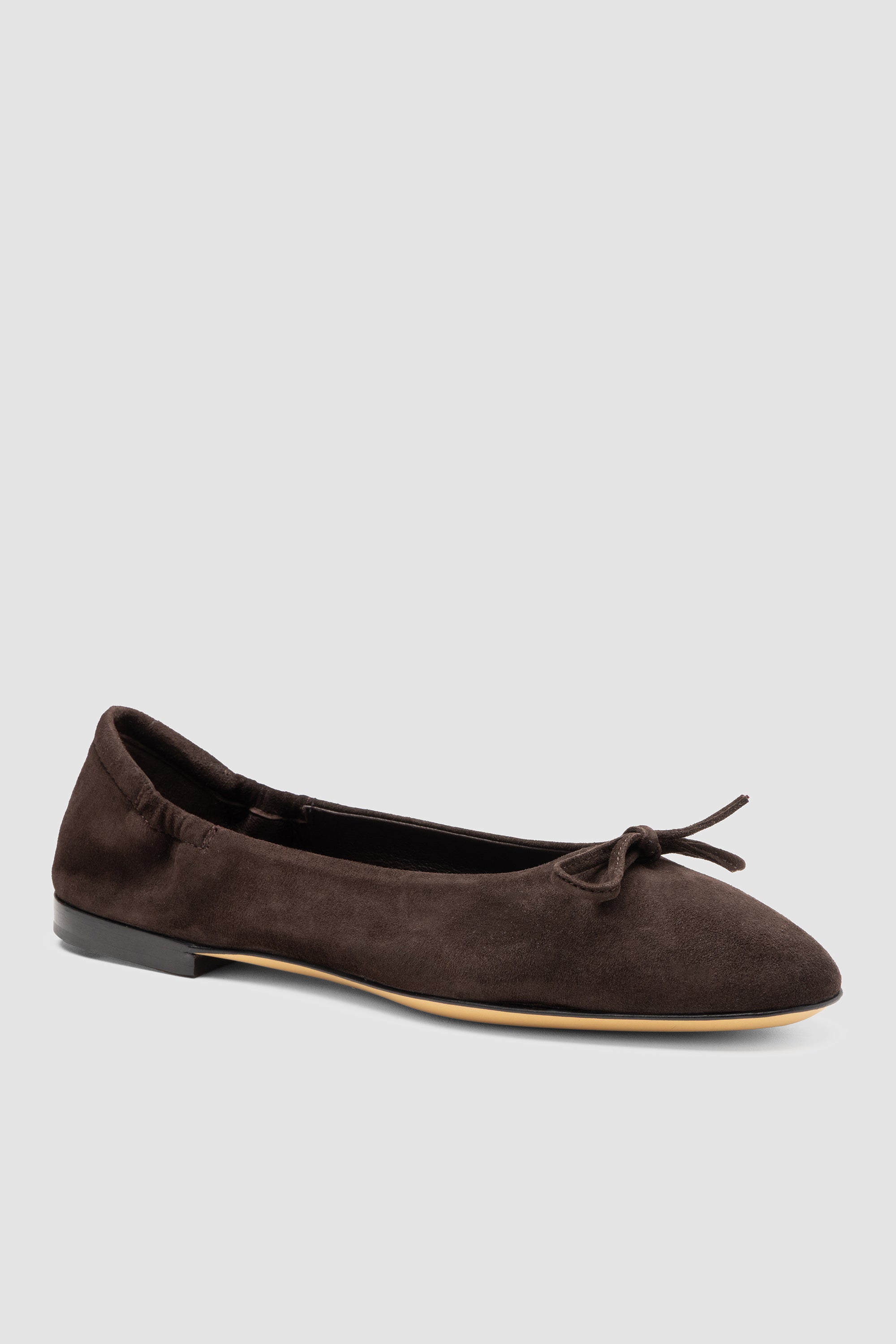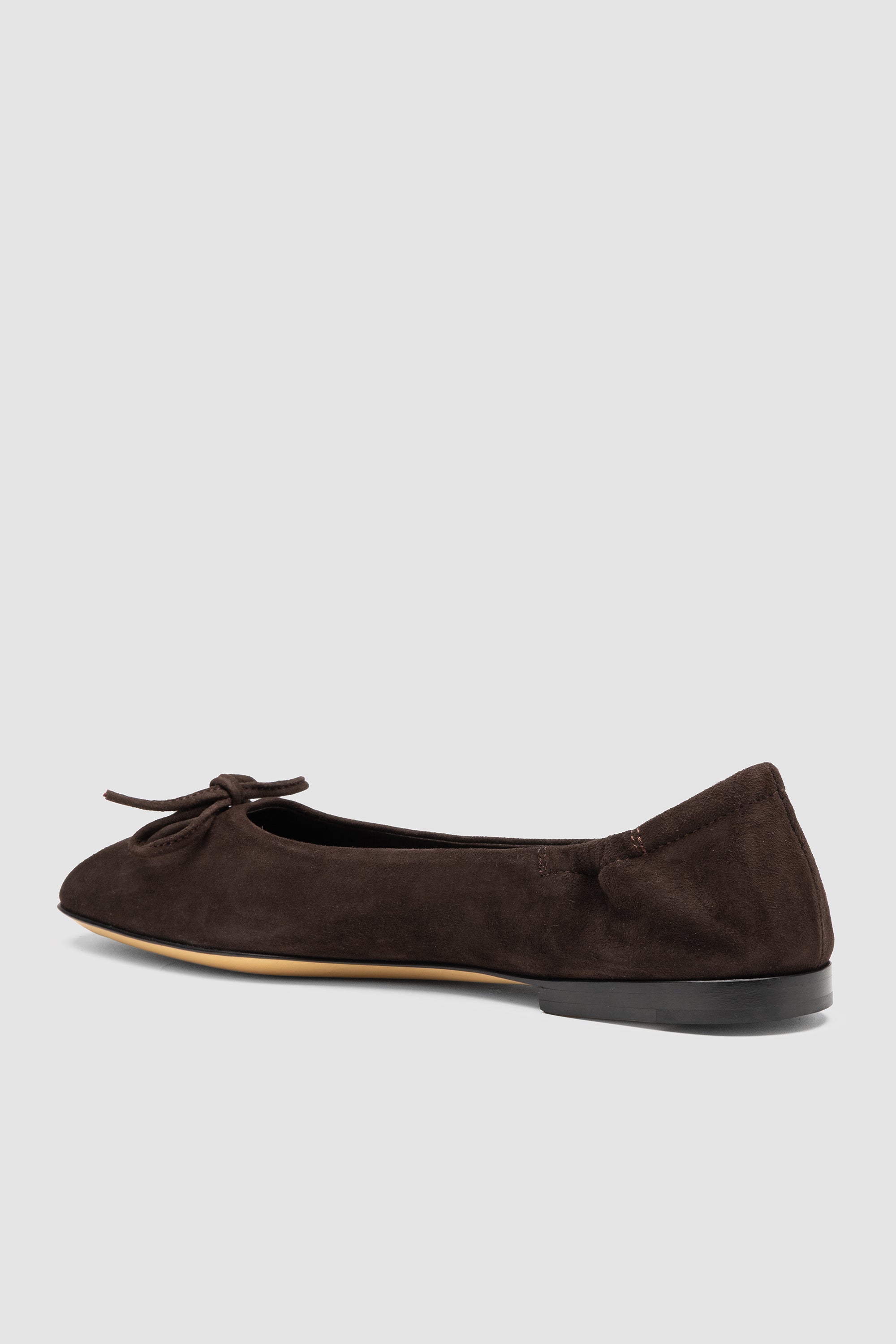Brown suede ballerina flat shoe, featuring a tied bow, with soft leather lining and leather sole with rubber inserts.