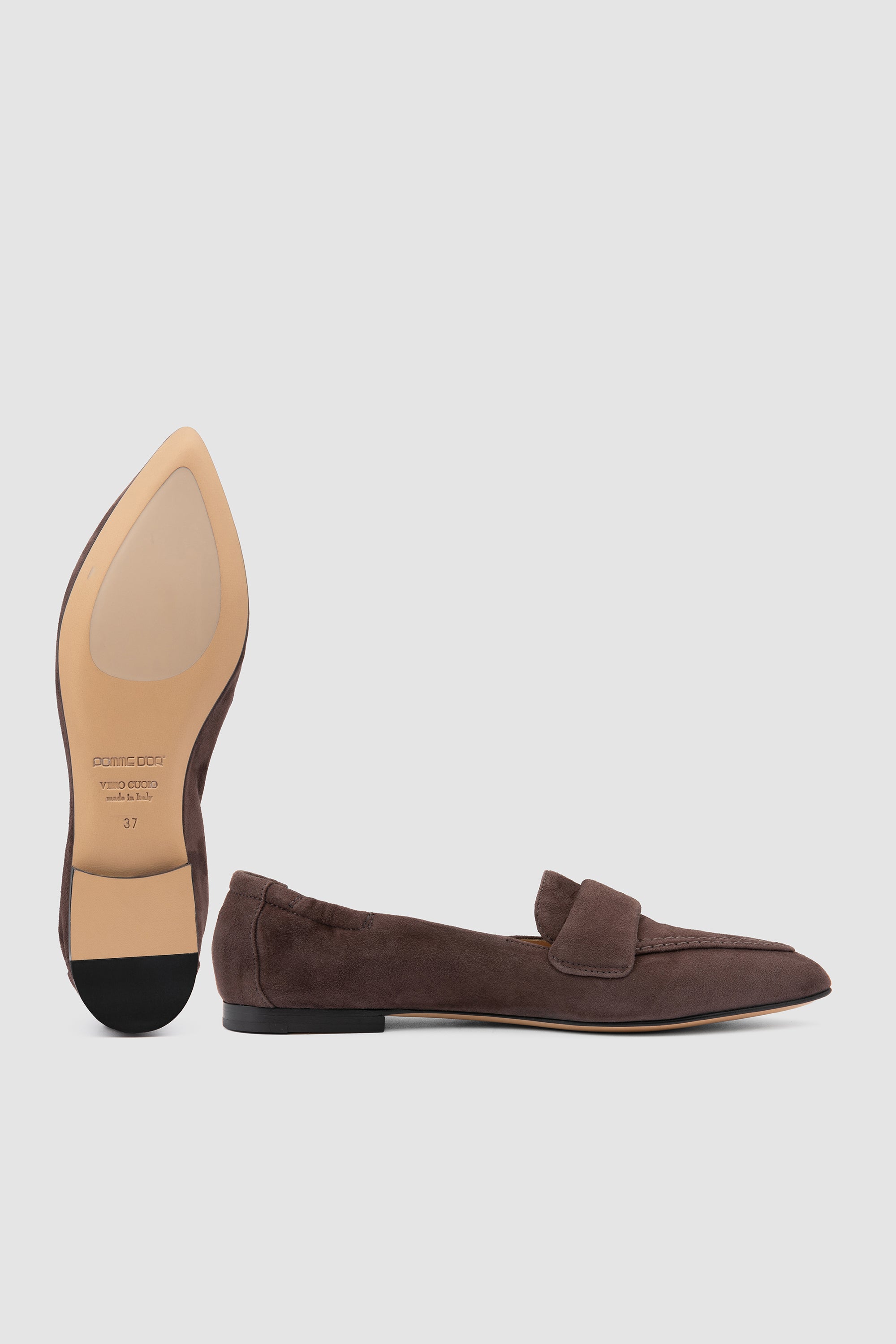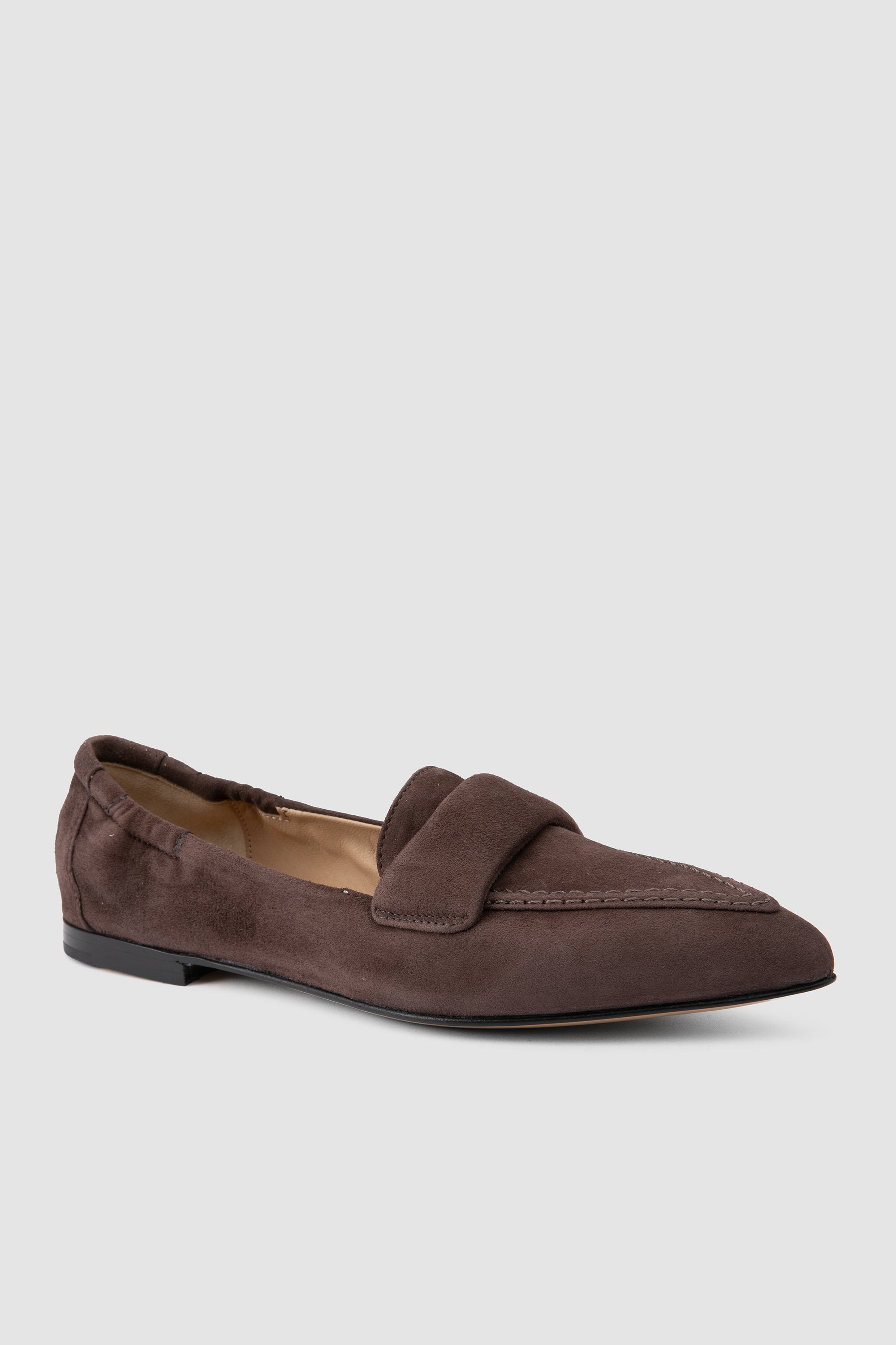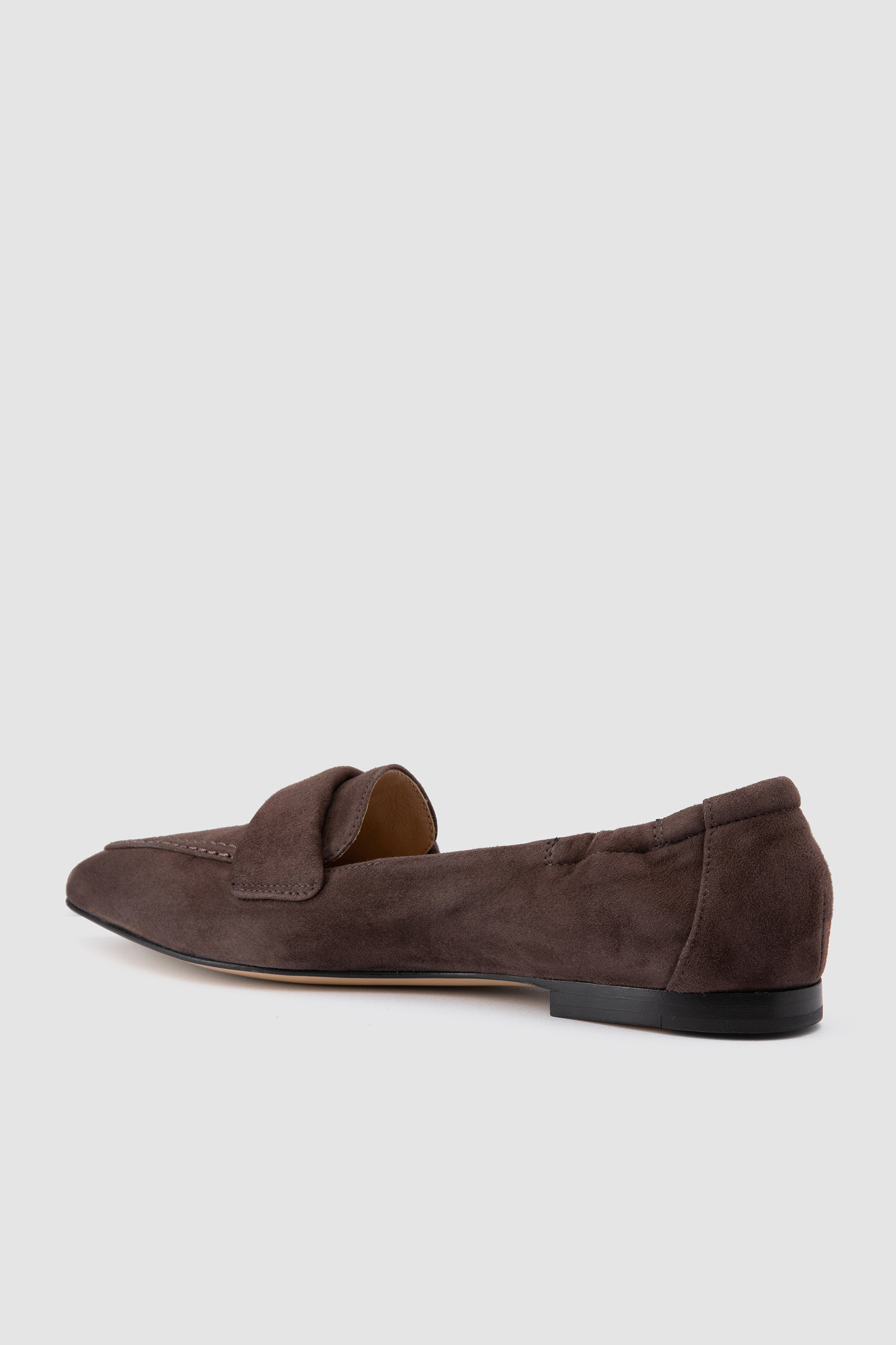 Brown suede leather flat loafer, with soft leather lining and leather sole with rubber inserts.