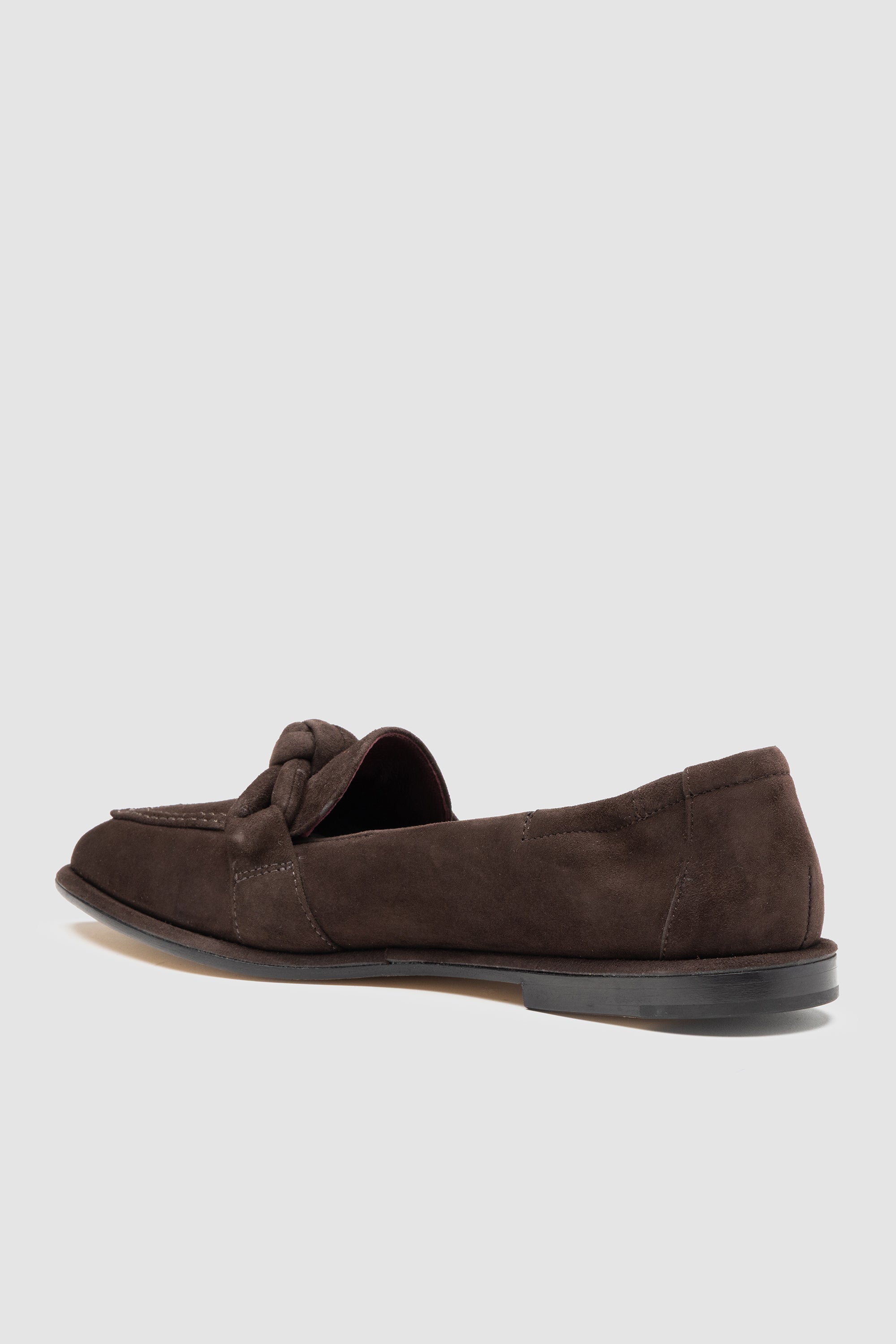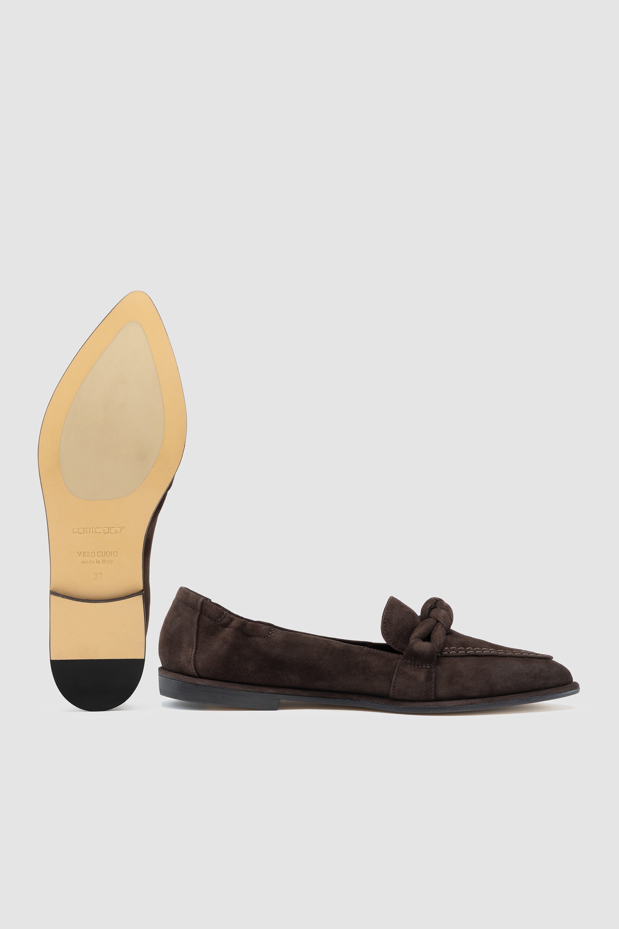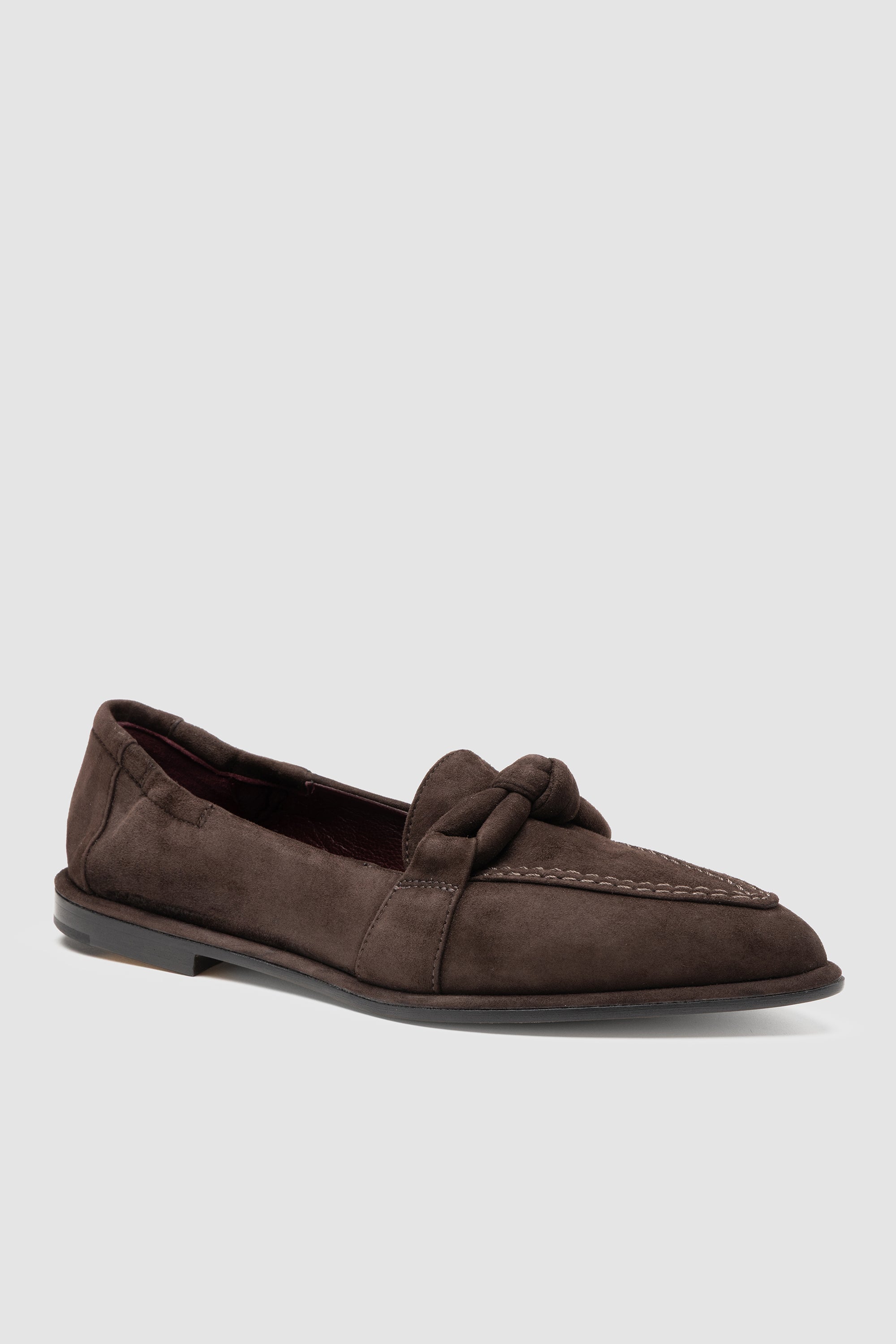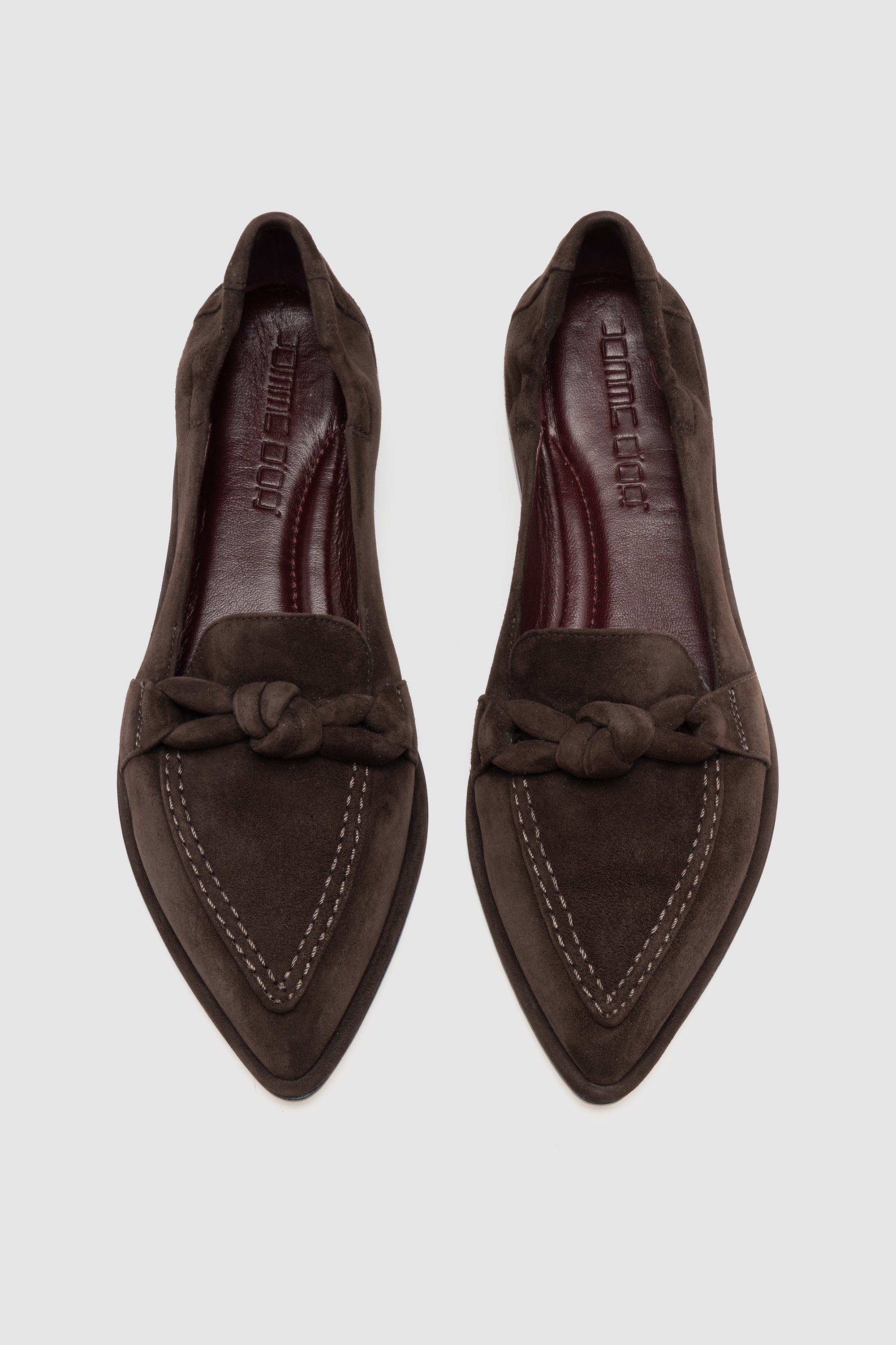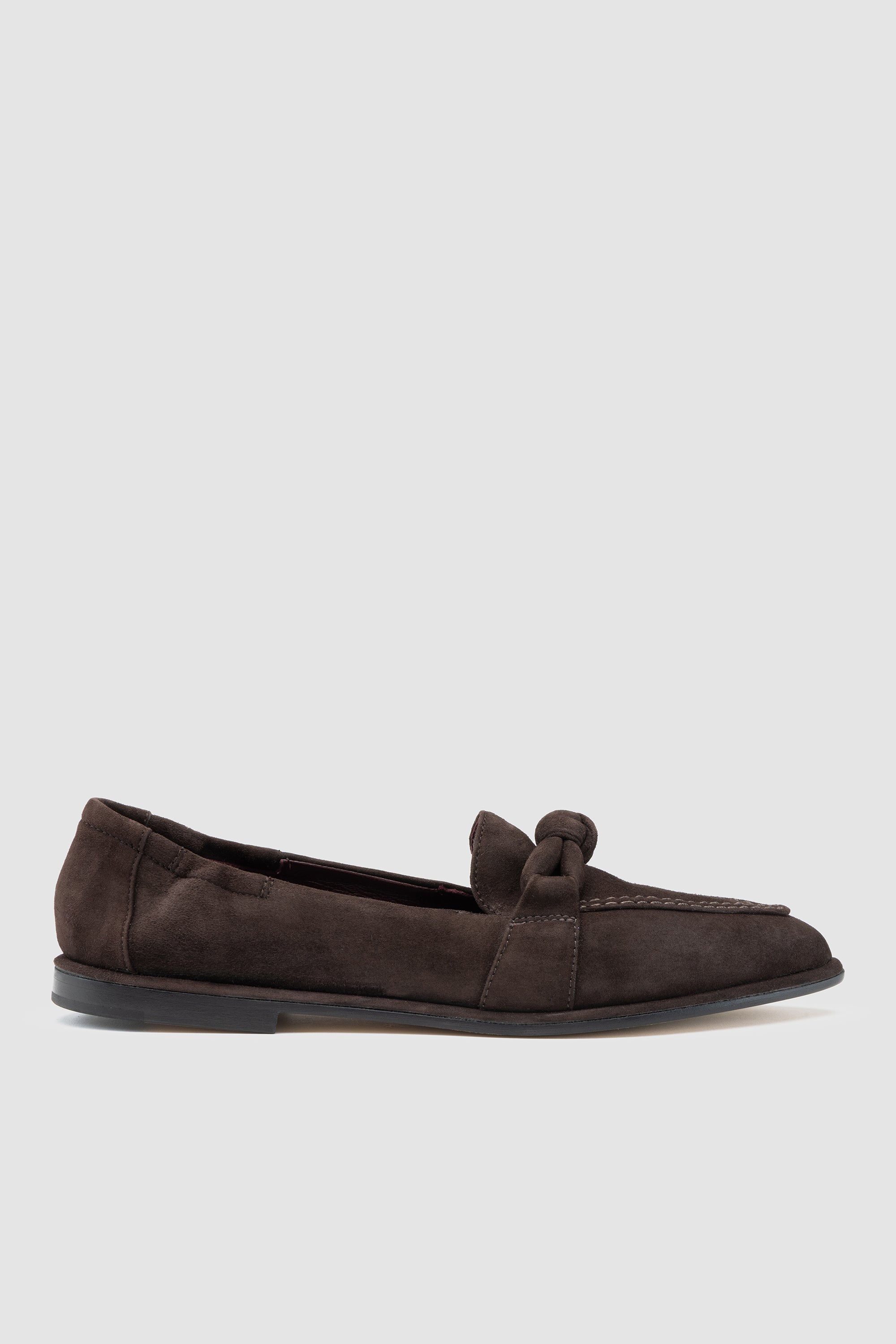 Dark brown suede leather flat shoe, featuring a bow detail, with soft leather lining and leather sole with rubber inserts.