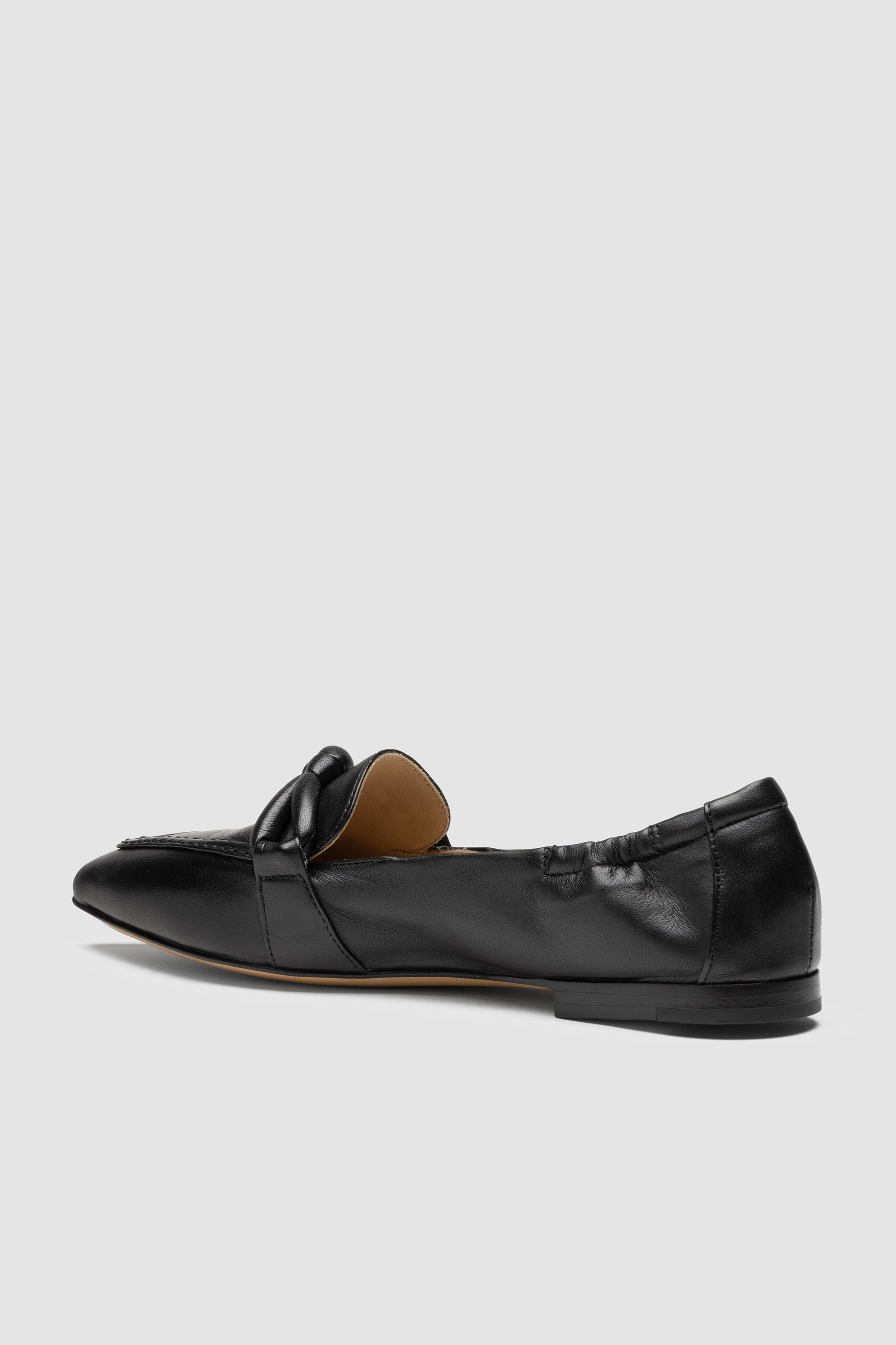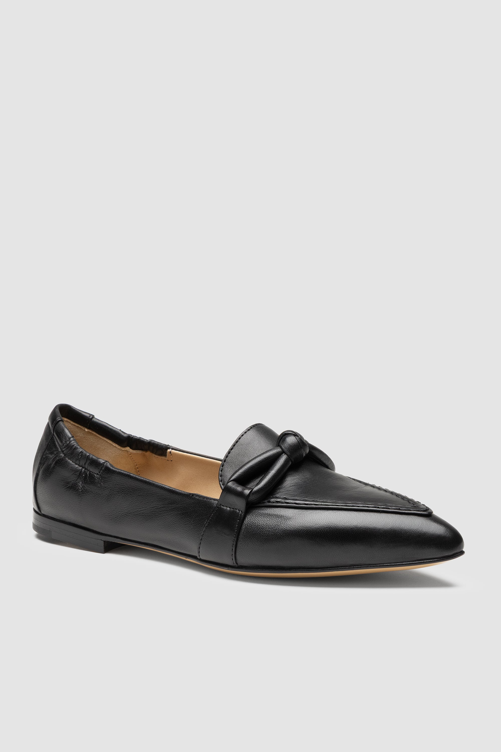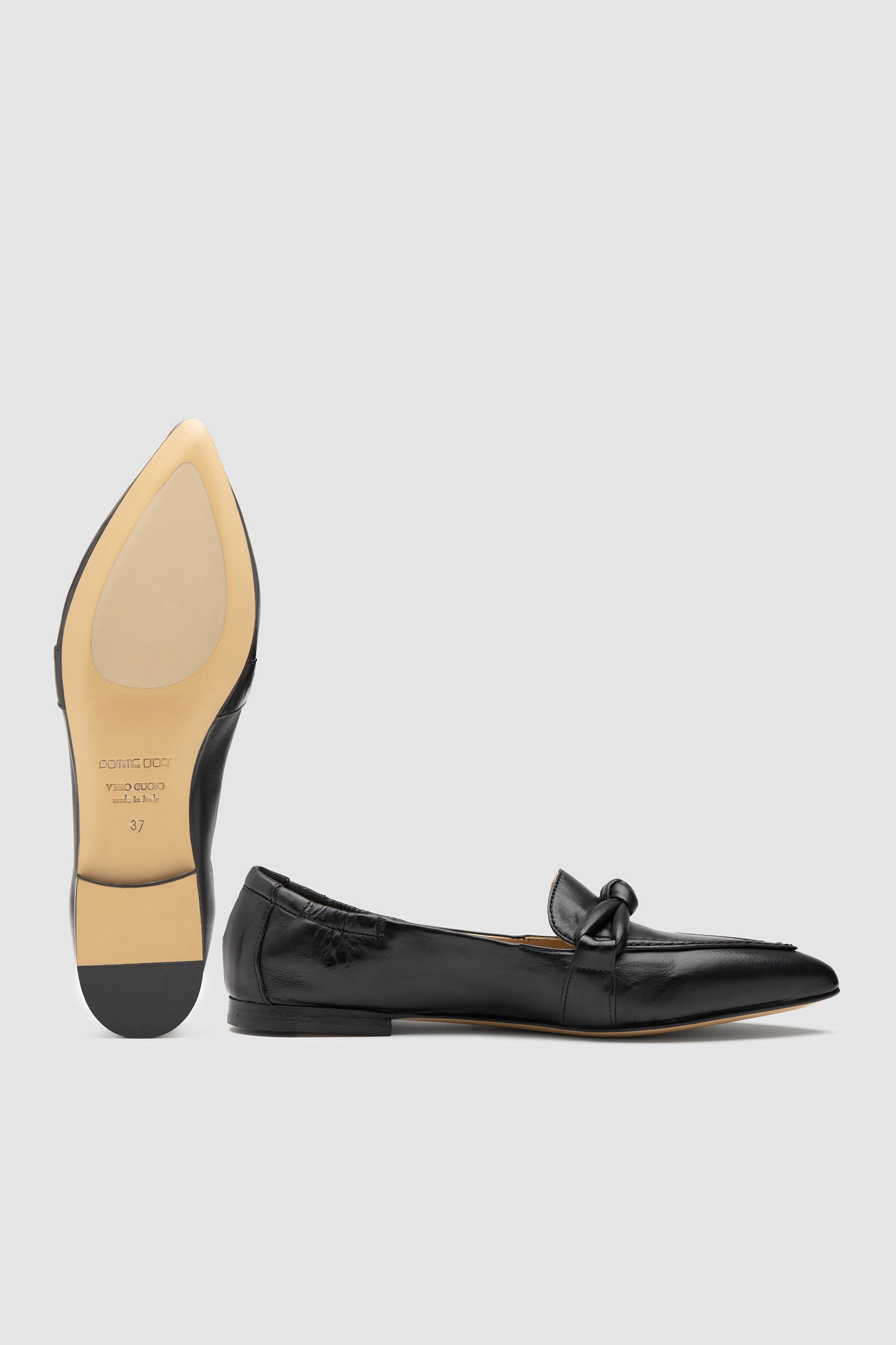 Black soft nappa leather flat shoe, featuring a bow detail, with soft leather lining and leather sole with rubber inserts.