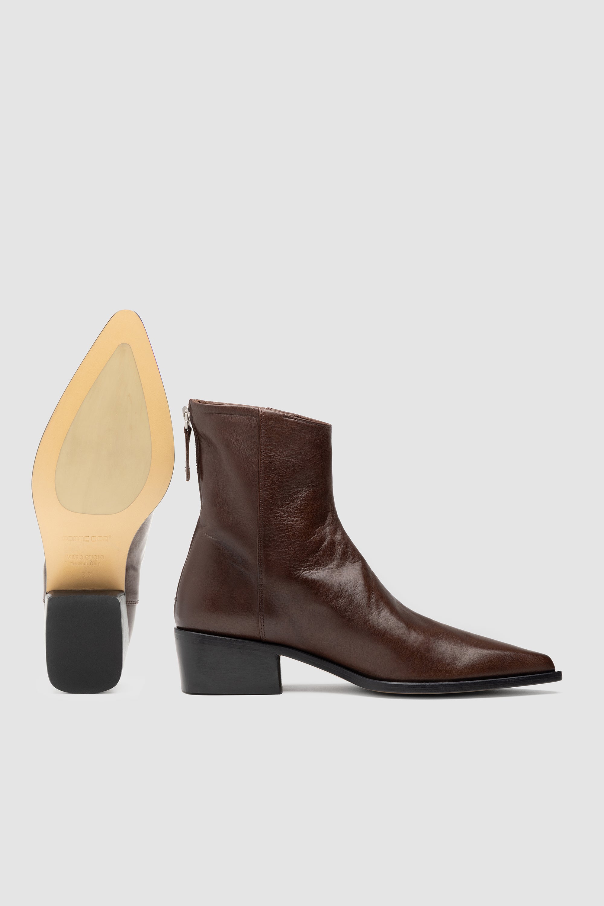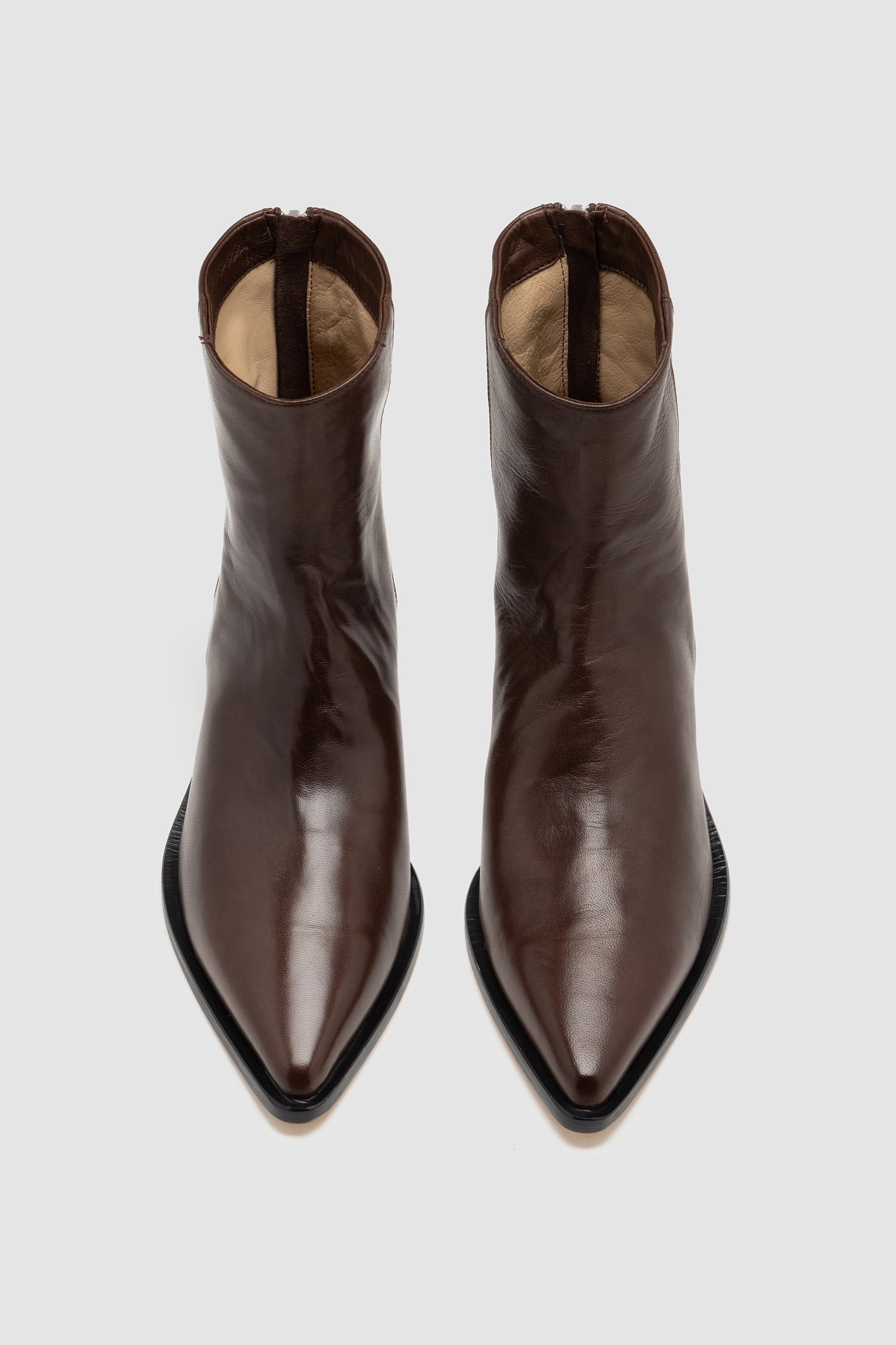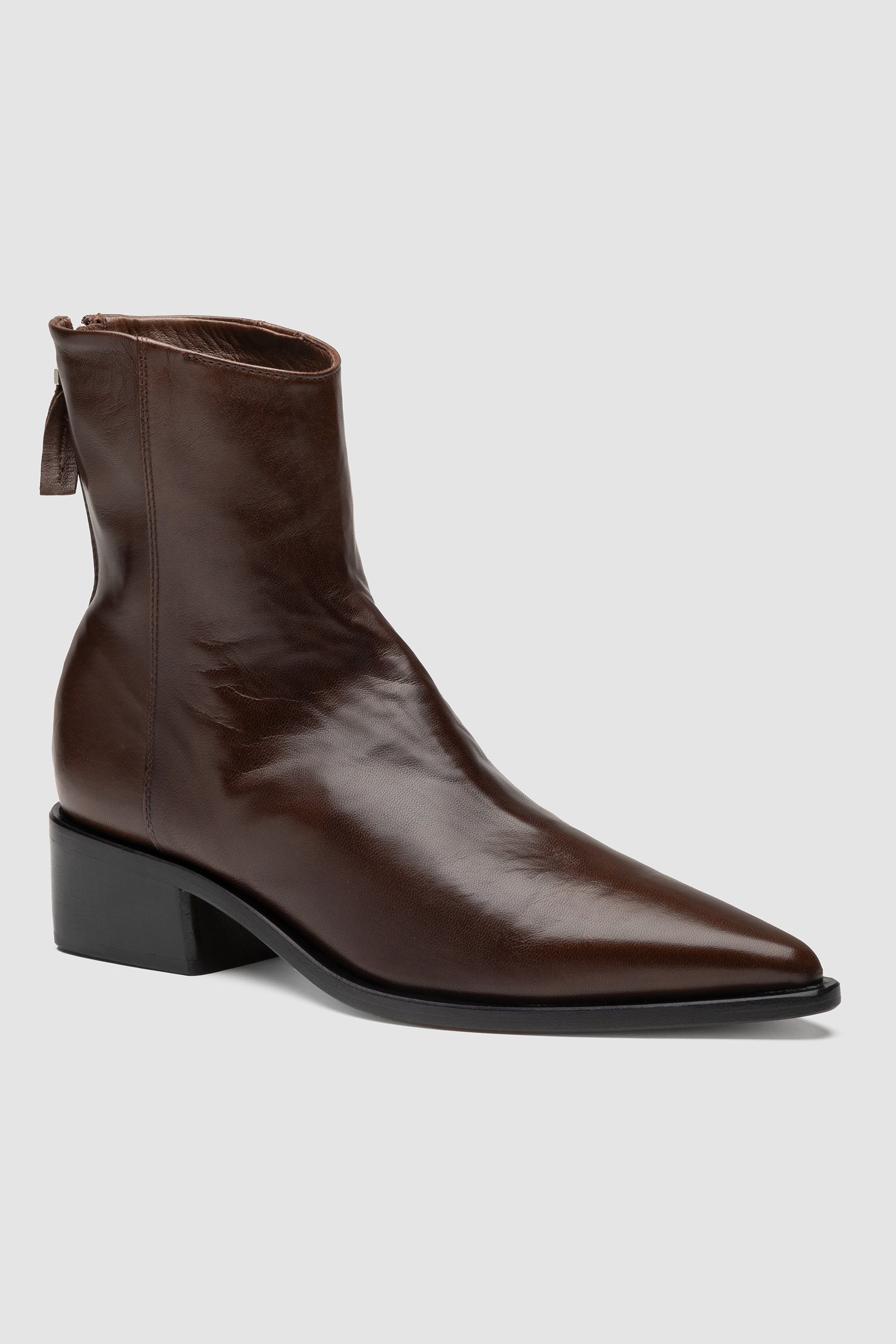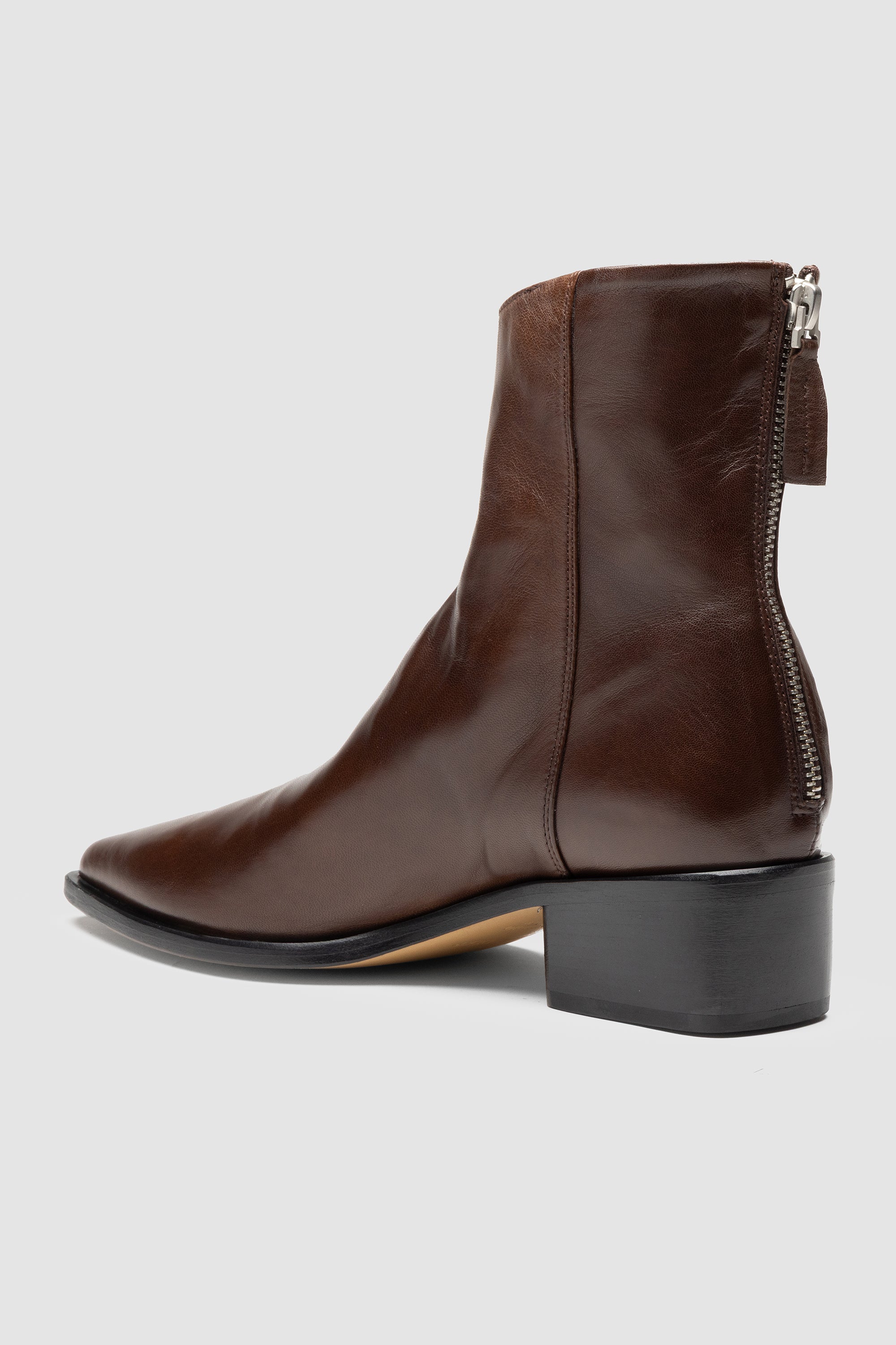 Brown nappa ankle boot with rear zip closure, soft leather lining and leather sole with rubber inserts.