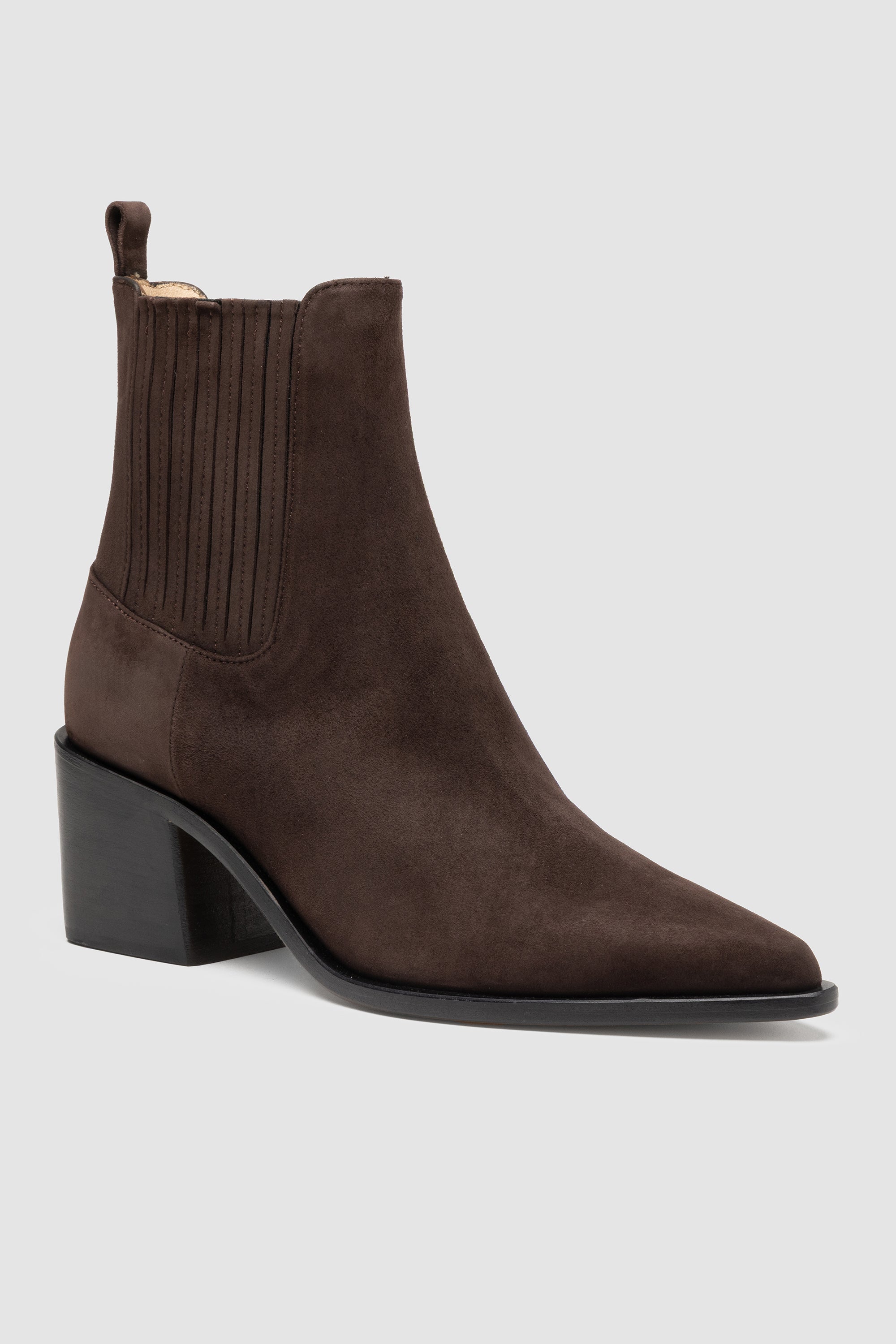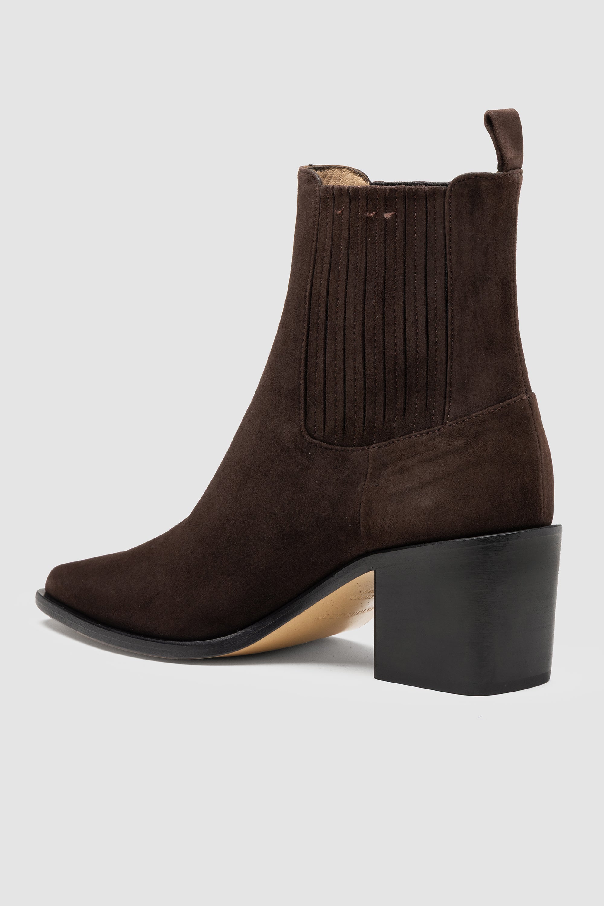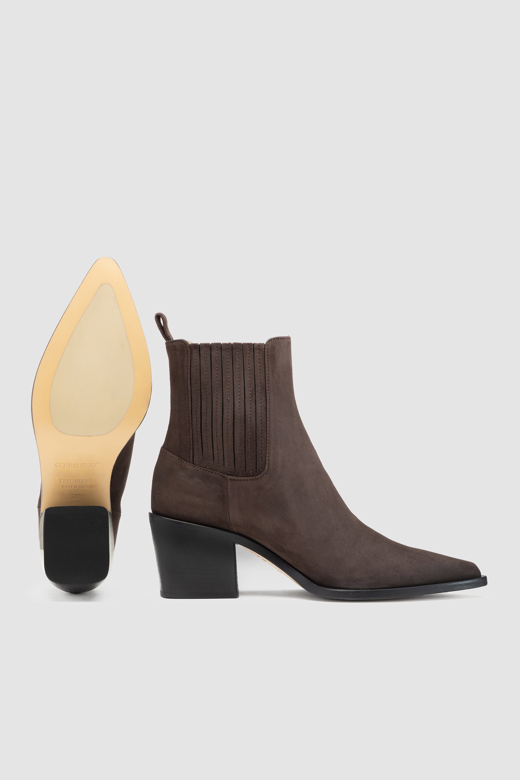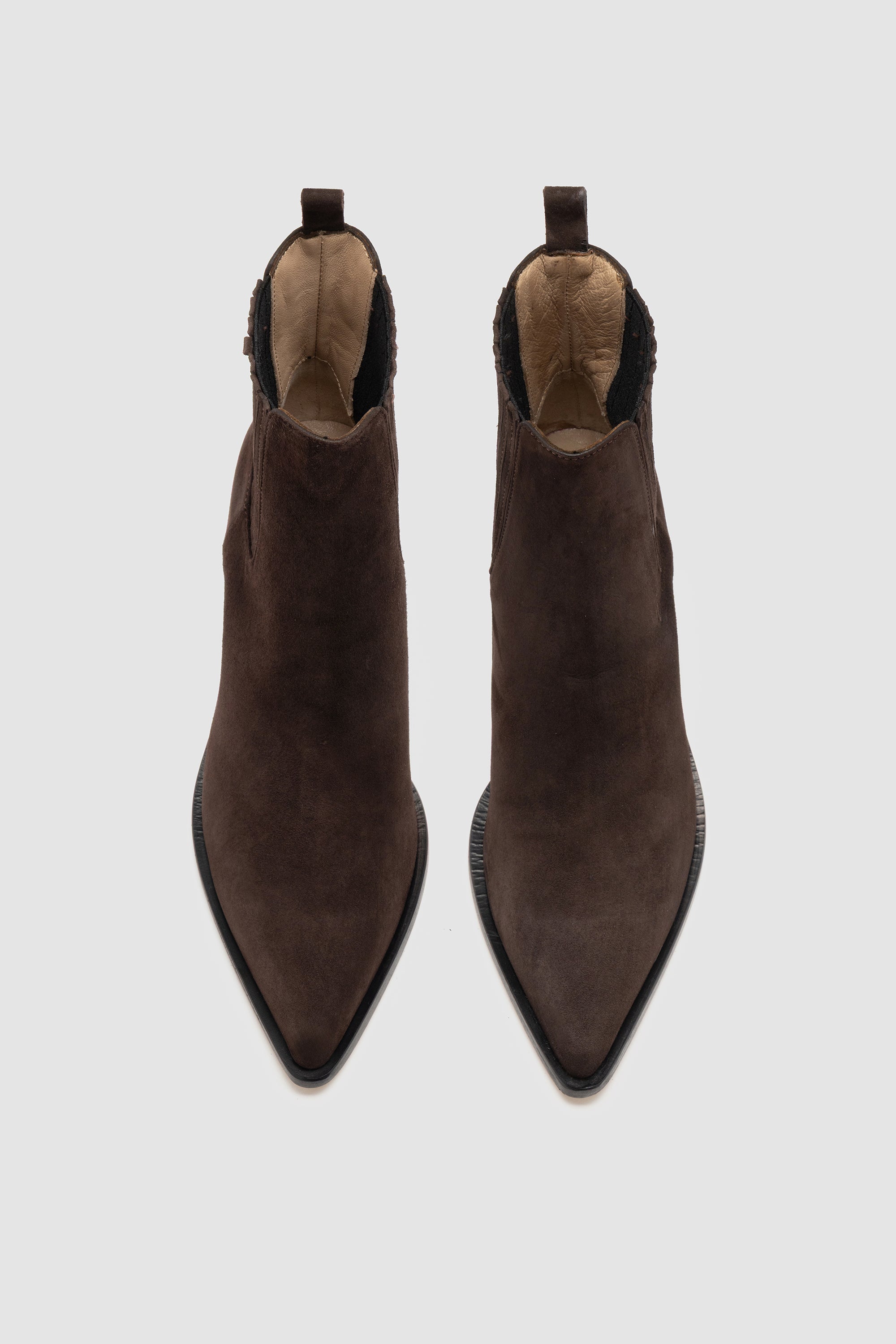 Brown suede ankle boot with side stretch panels, soft leather lining and leather sole with rubber inserts.