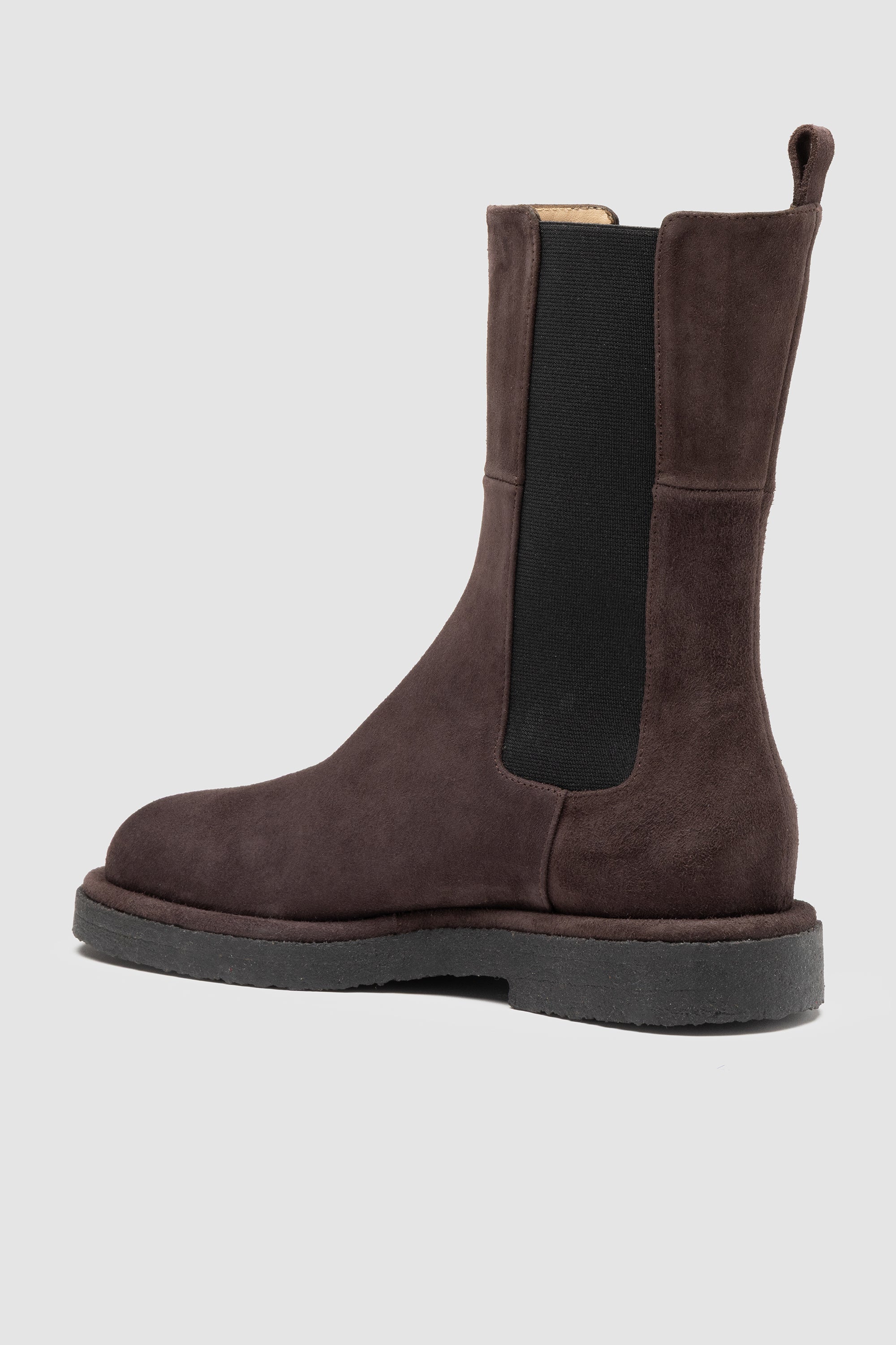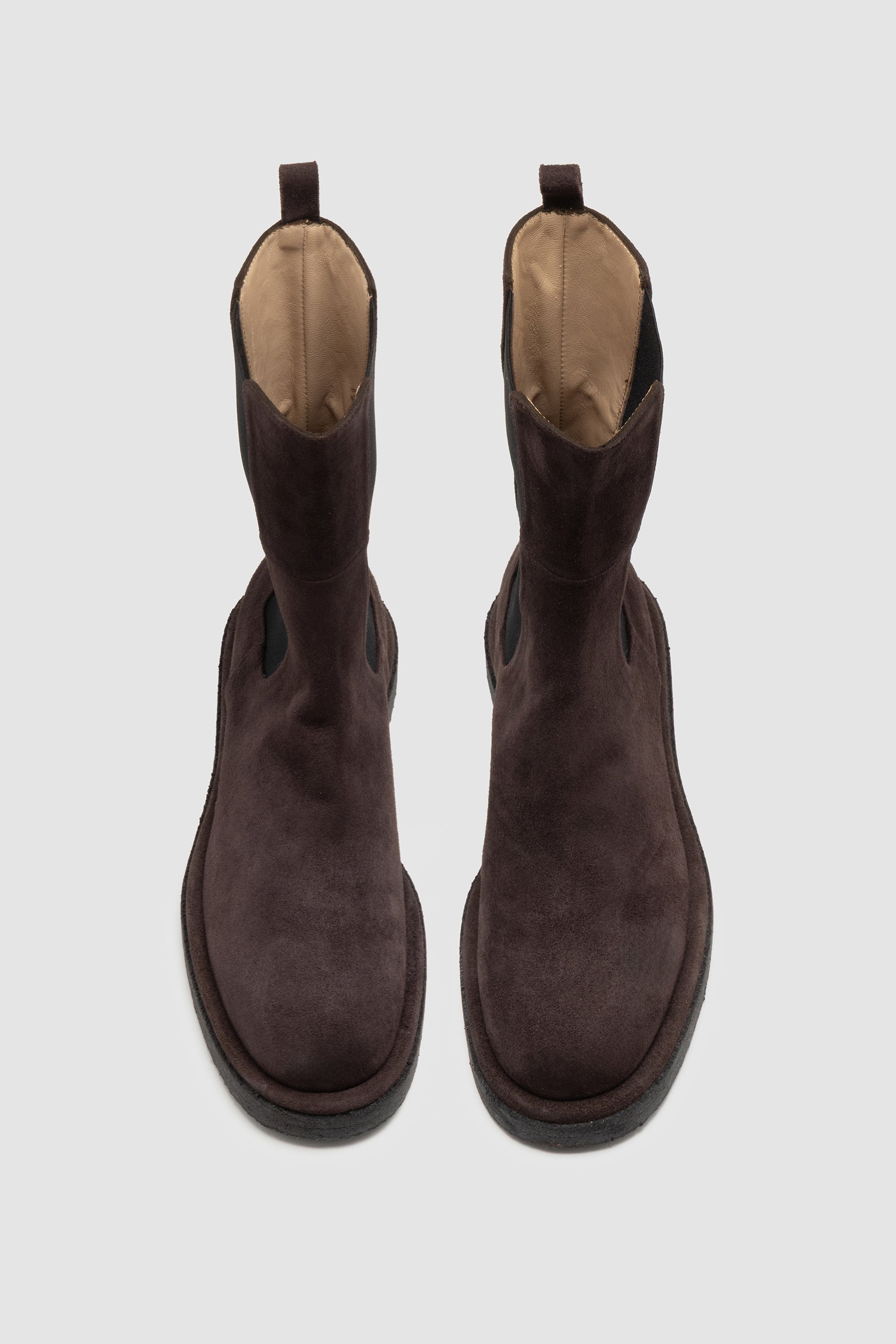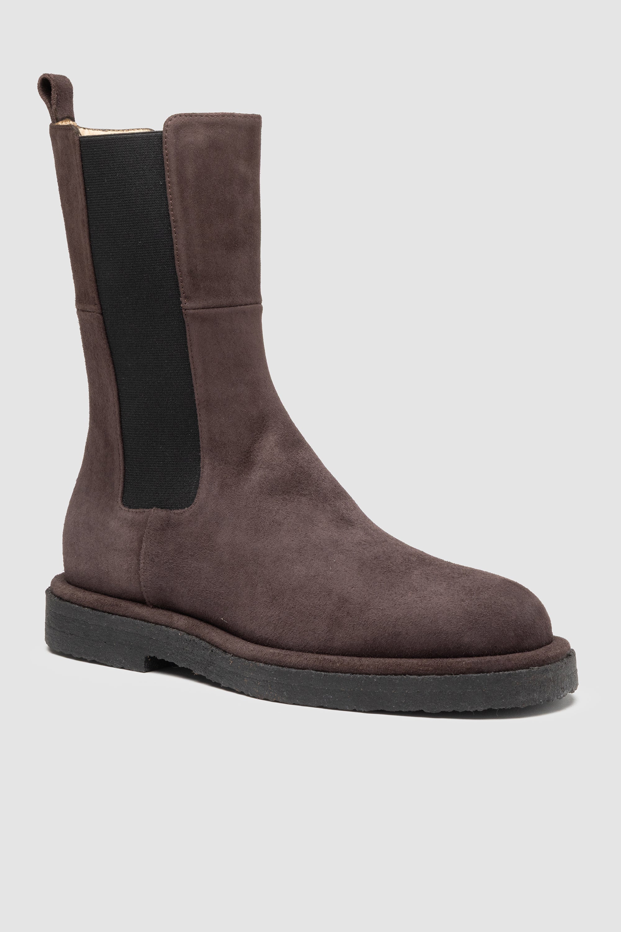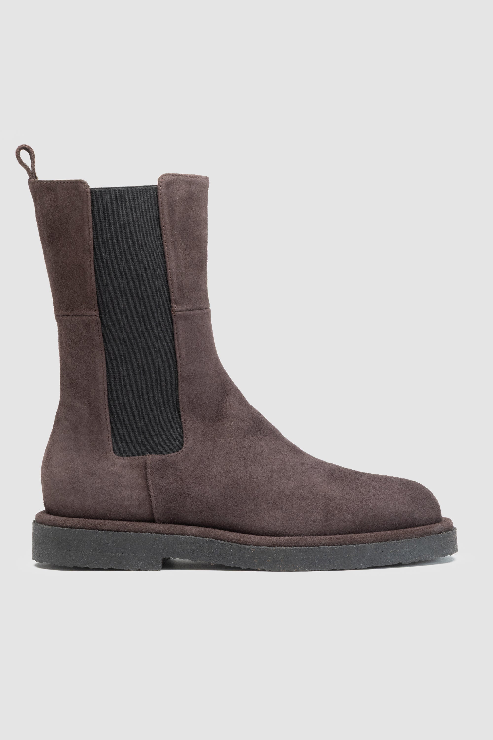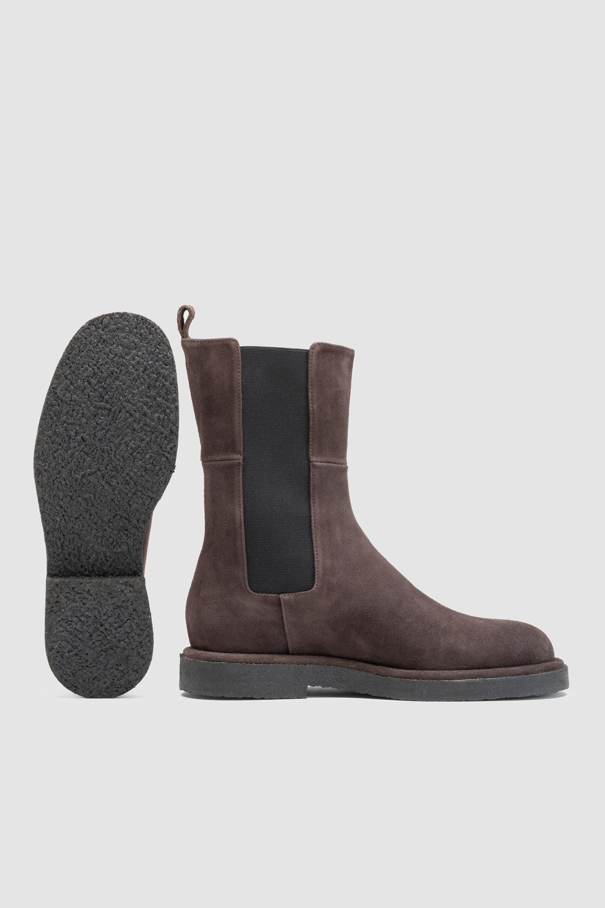 Lightly greased suede boot, with side elastic fabric inserts, soft leather lining and natural crepe rubber sole.