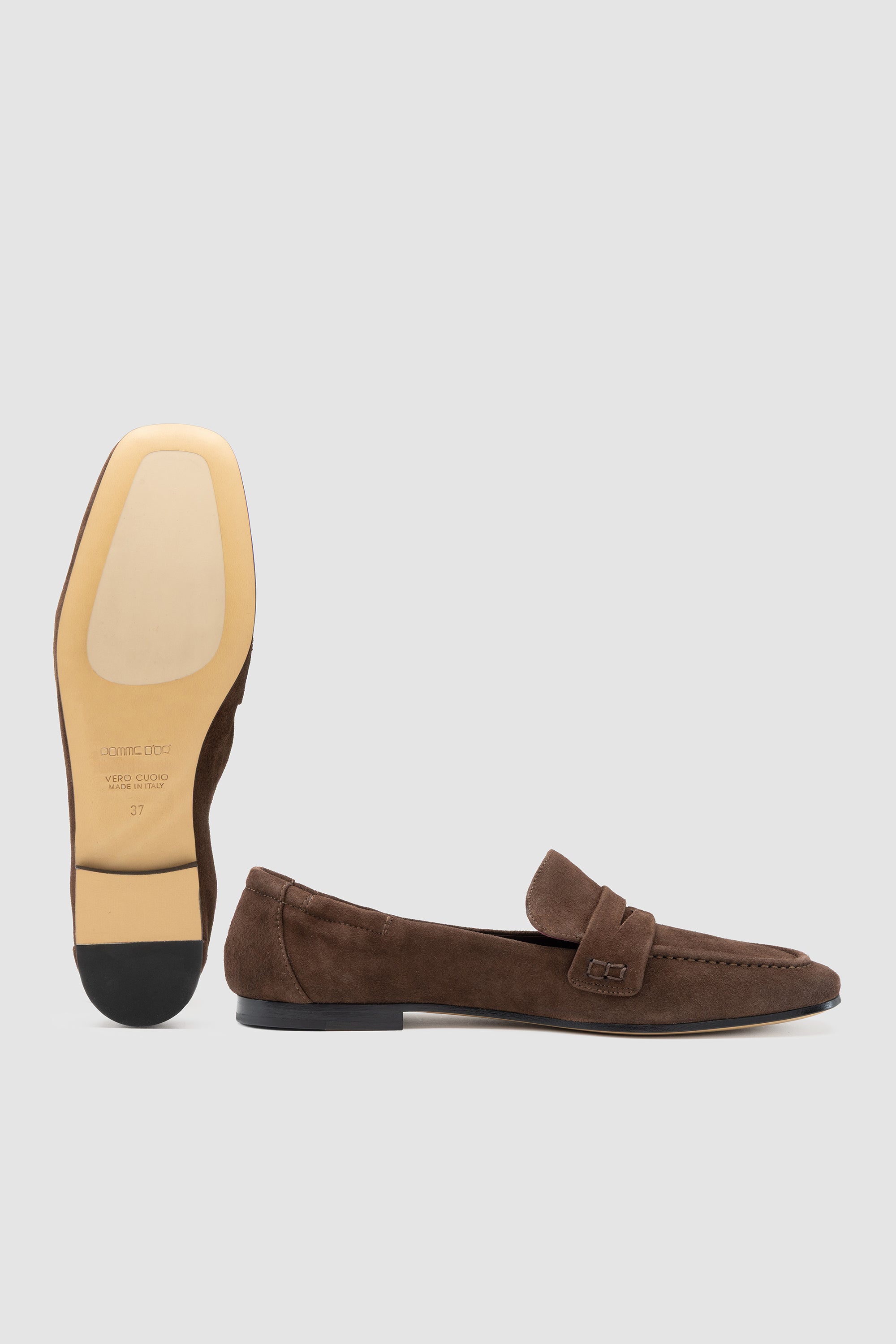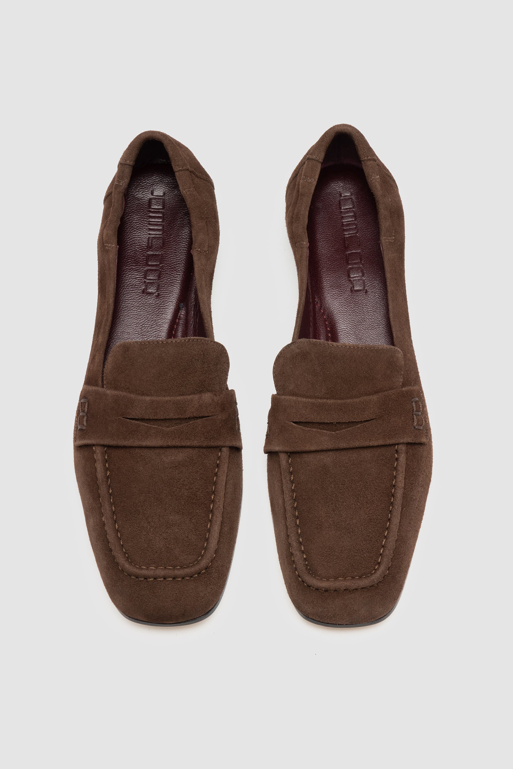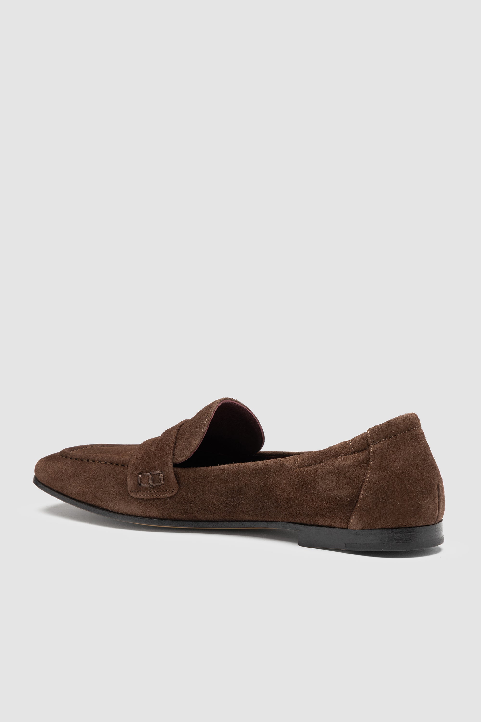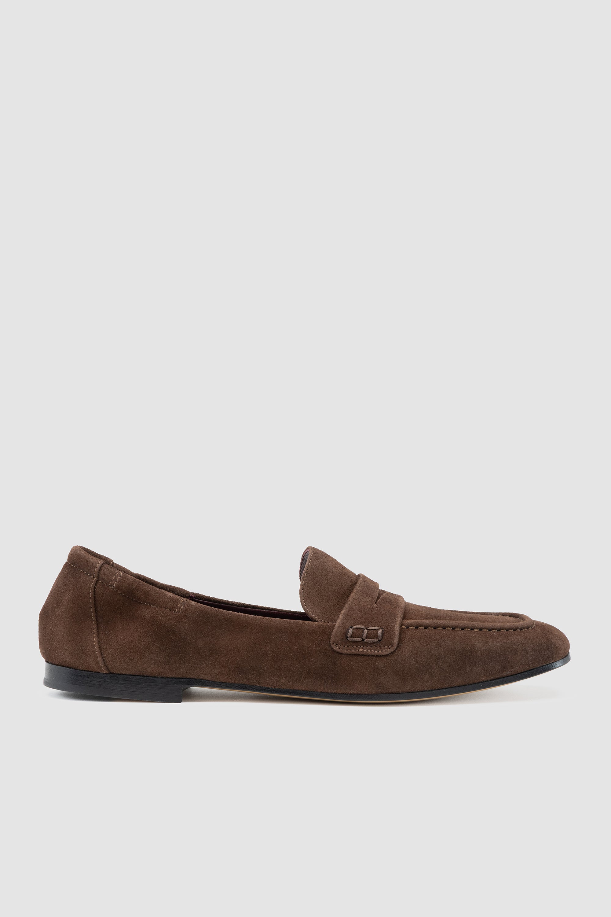 Brown lightly greased suede flat loafer, with soft leather lining and leather sole with rubber insert.