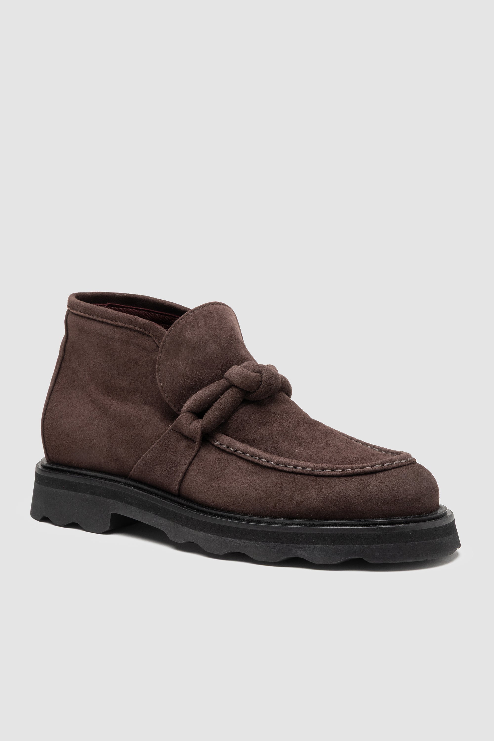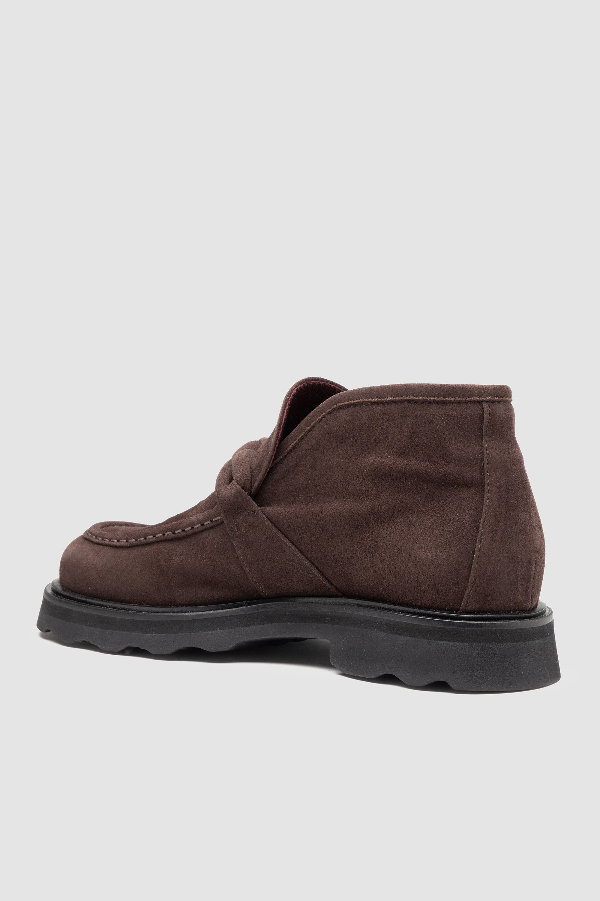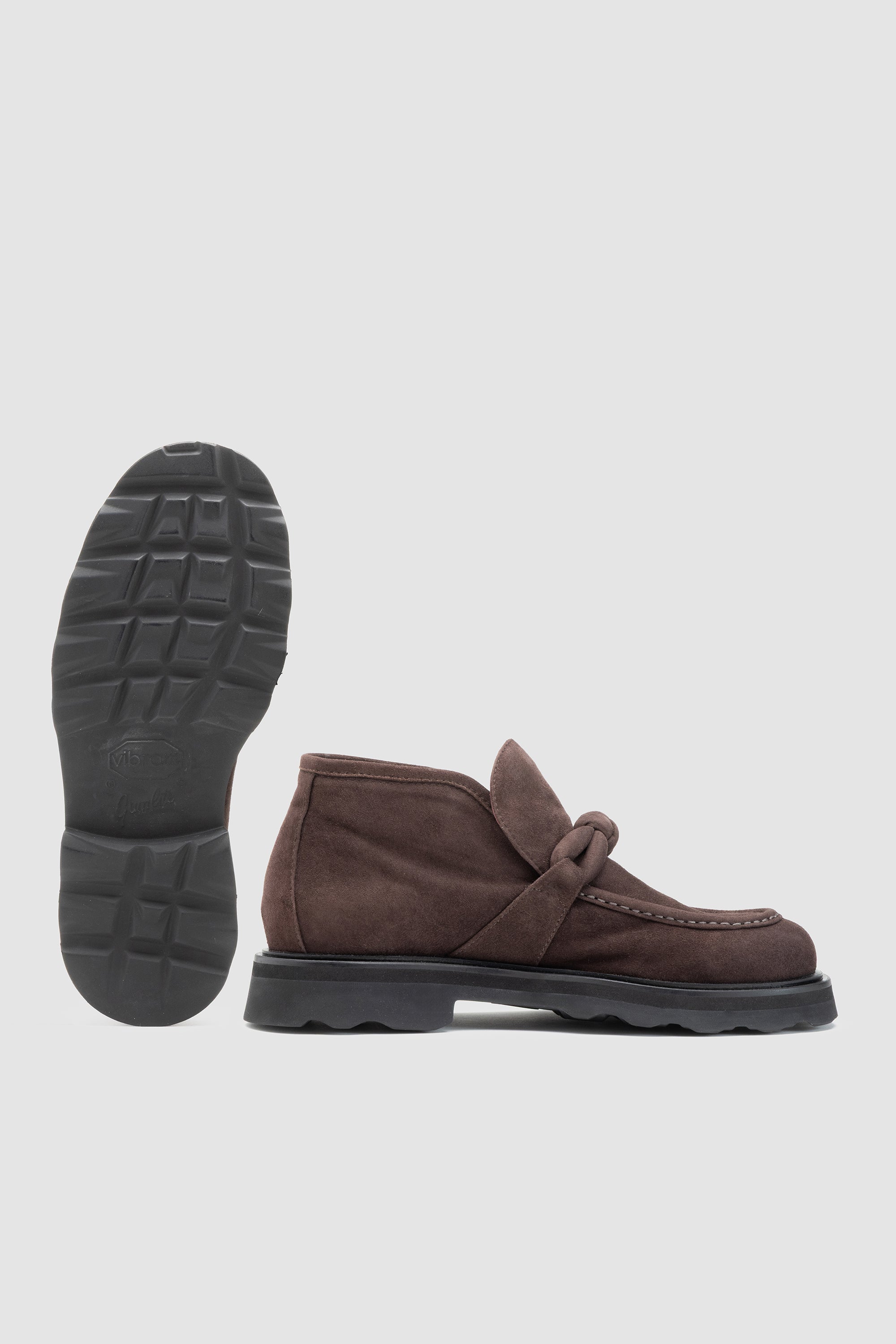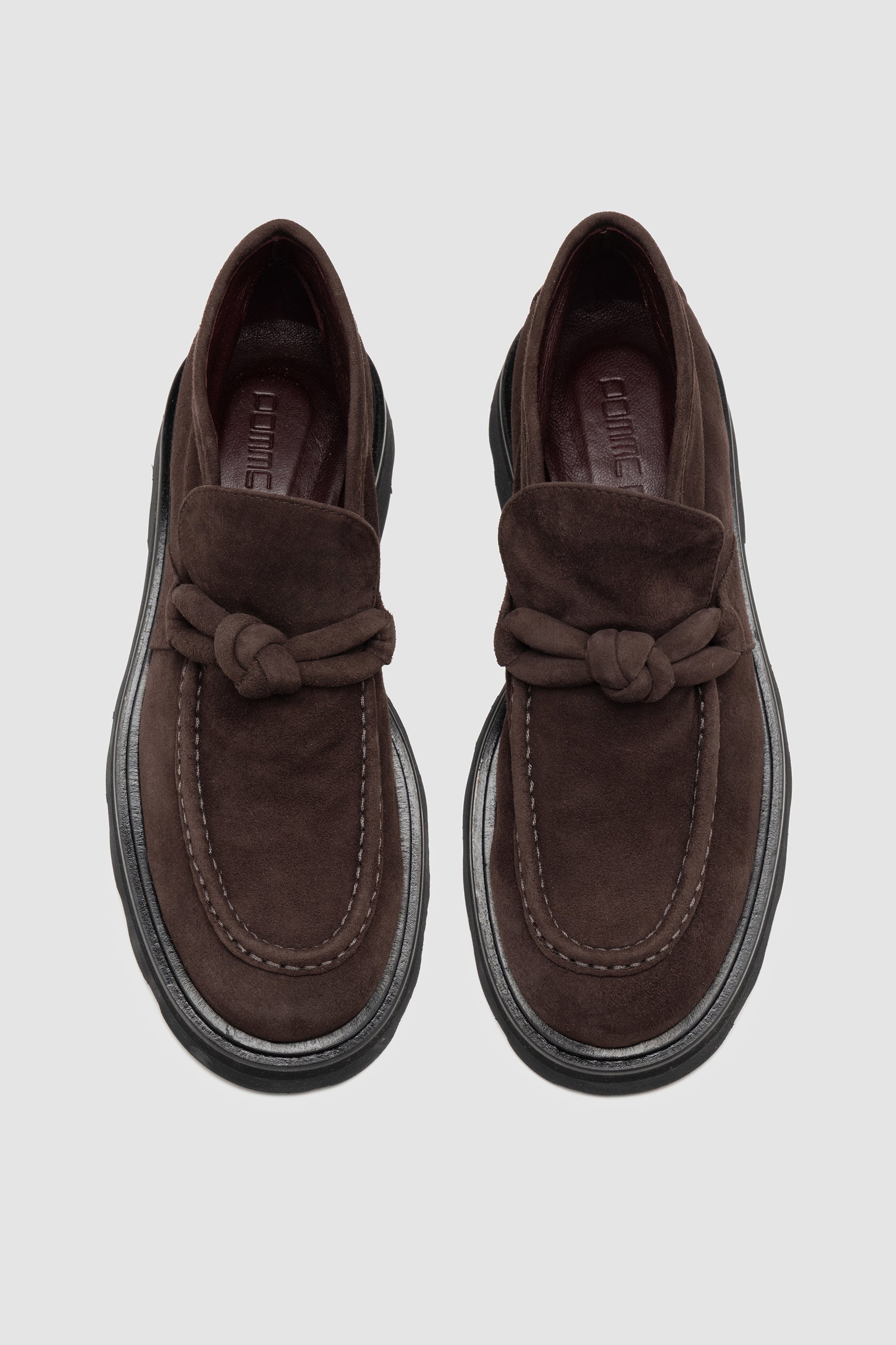 Suede loafers, lightly greased, featuring a bow detail, soft leather lining and a rubber lug sole.