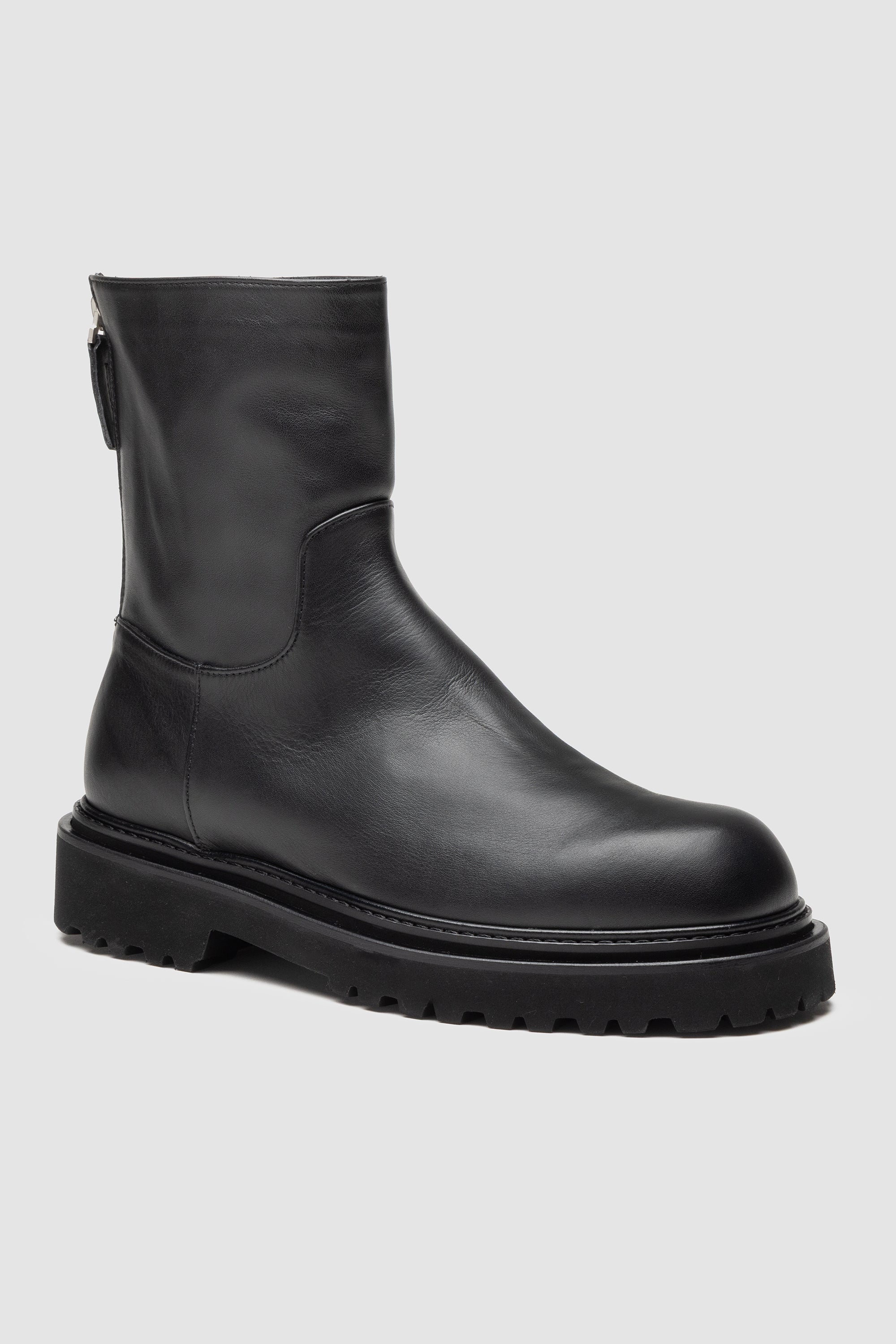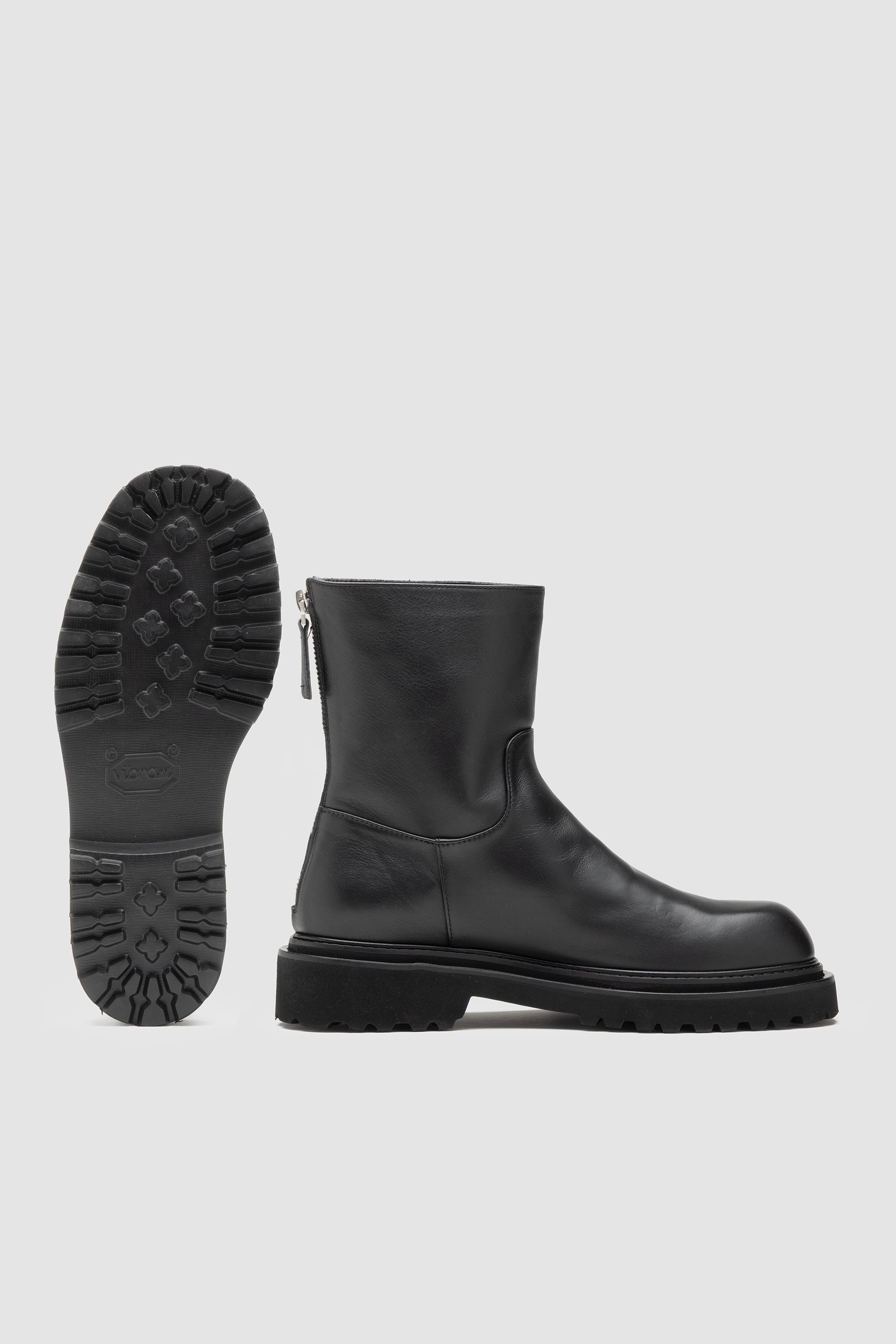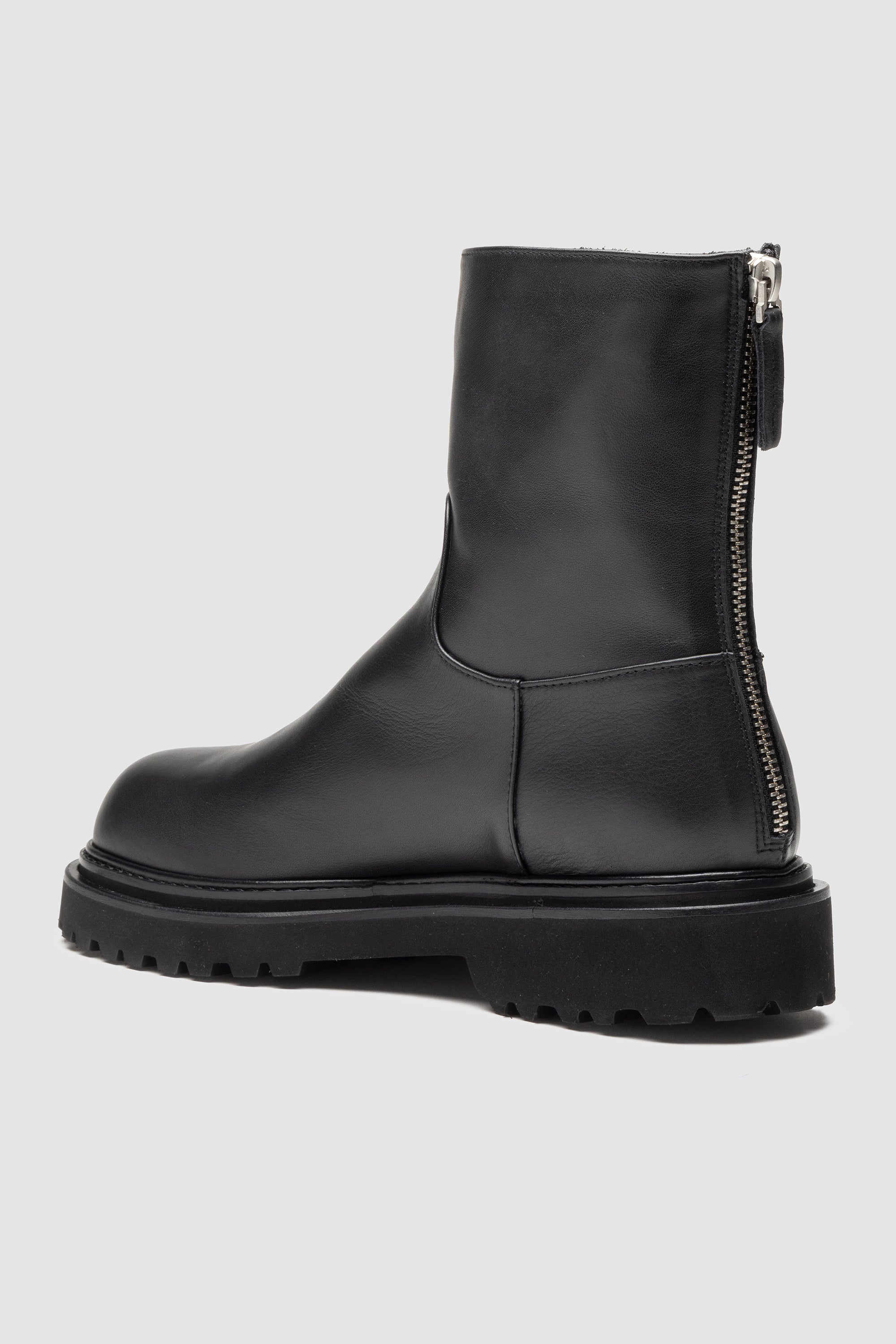 Black smooth leather boot, with rear zip fastening, soft leather lining and rubber lug sole.