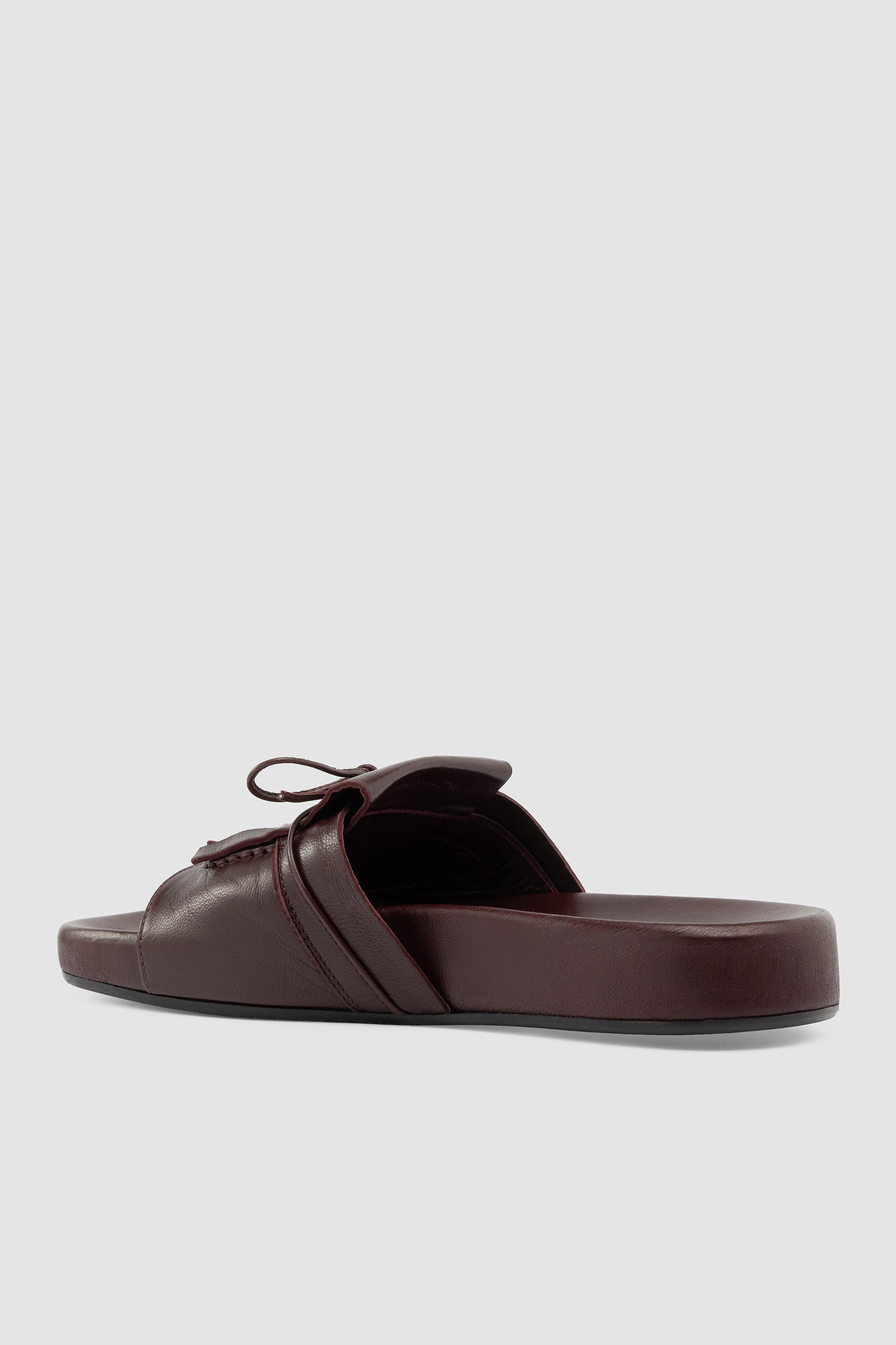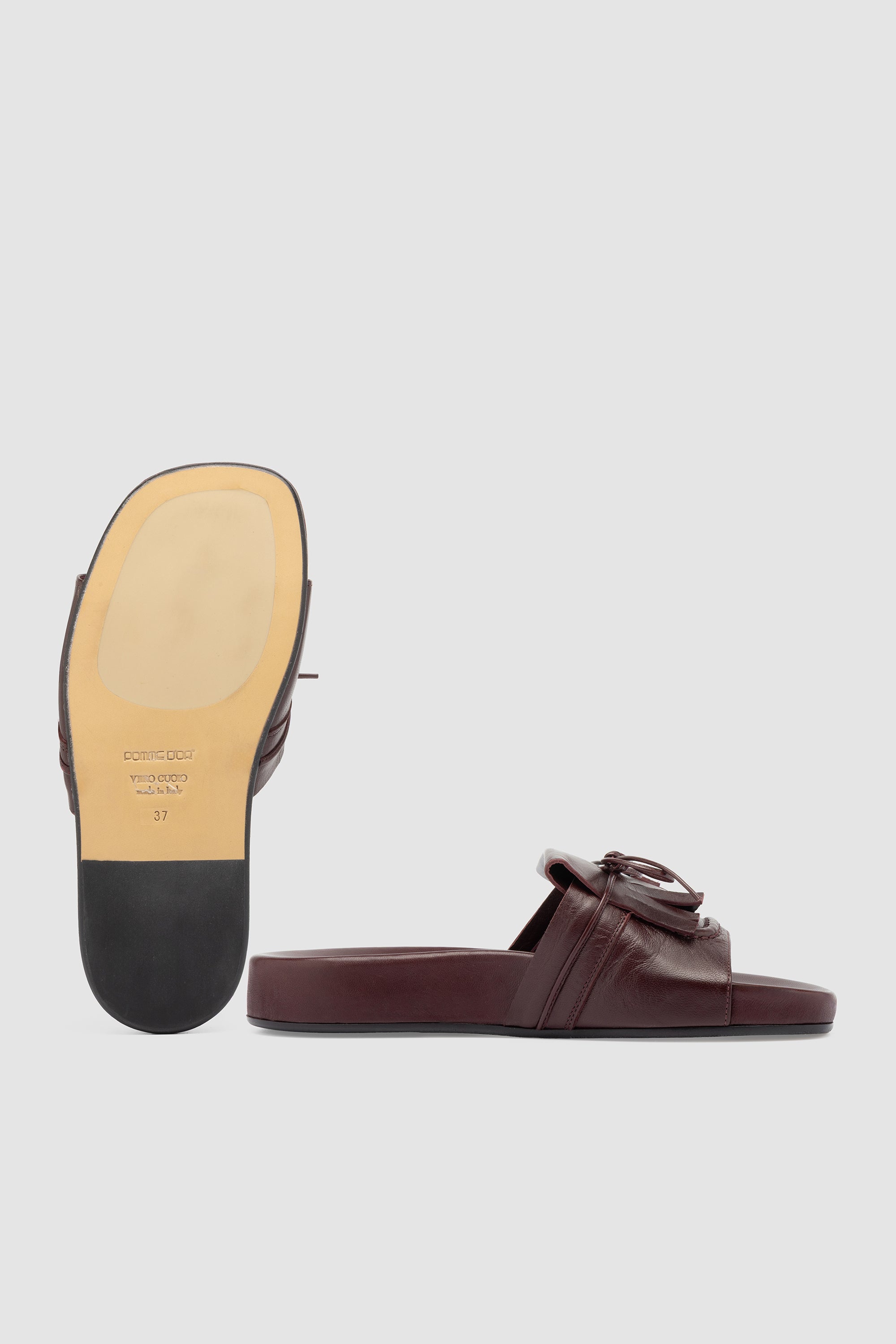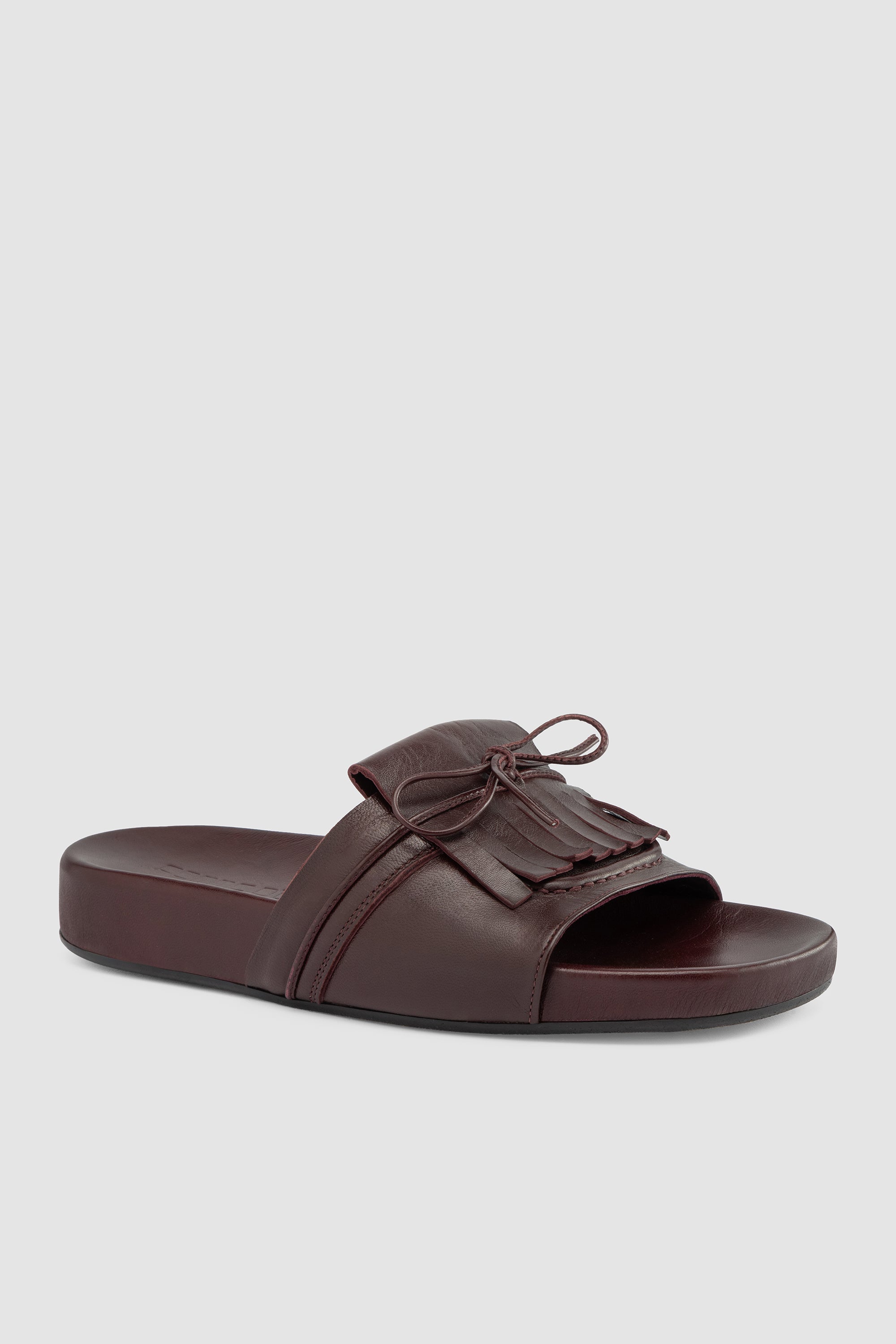 Flat sandal in burgundy leather featuring a wide strap with layered fringe details and a tied leather lace. Leather lining and a leather sole with a rubber insert.